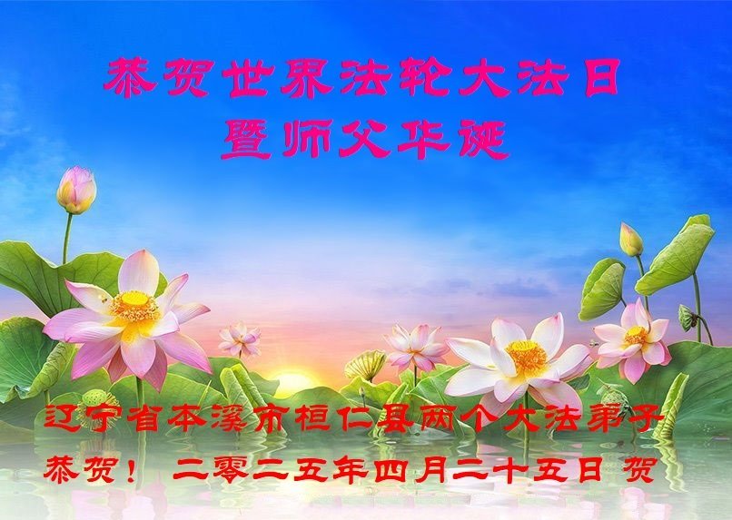 恭贺世界法轮大法日! 恭祝慈悲伟大的师尊生日快乐! 弟子感恩师尊的救度之恩。做好三件事。弟子叩拜! 辽宁省本溪市一家父子俩大法弟子敬上 二零二五年四月二十五日 辽宁省本溪桓仁县大法弟子项目组同修普天同庆世界法轮大法日暨敬祝师尊华诞!