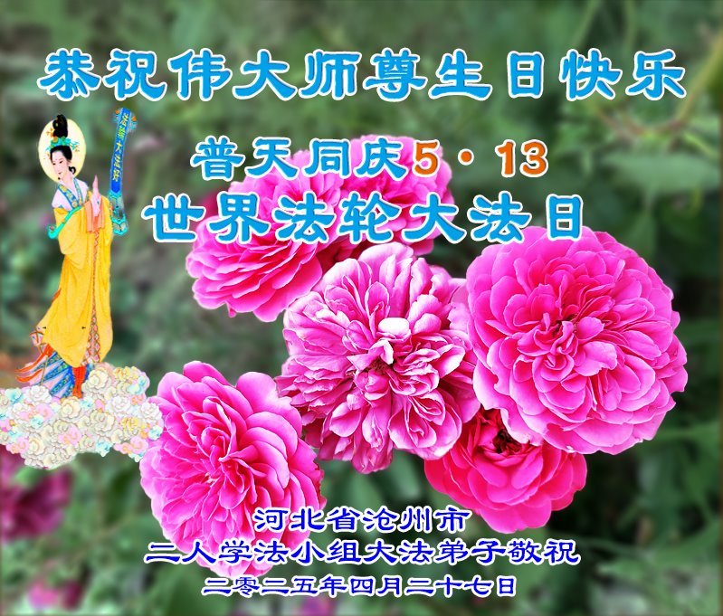 5月13日这个伟大的日子,多少世人沐浴大法之光开始道德重建;多少弟子修大法再现世间道德辉煌!师父还赋予了大法弟子最好的一切,不断慈悲的保护,使我们能践行真善忍的高层次法理!弟子们一定修好自己,做好三件事,要正念,多学法,学好法,多救人。在最后阶段,弟子要更精進。 在这普天同庆的日子里,我们感谢师父的再造之恩,弟子们送上最诚挚恭敬的祝愿,恭祝师父生日快乐!恭贺世界法轮大法日!师父您辛苦了! 河北省沧州市泊头市一学法小组大法弟子敬上 二零二五年五月四日 河北省沧州市一学法小组二位大法弟子恭祝师尊生日快乐!恭贺世界法轮大法日!