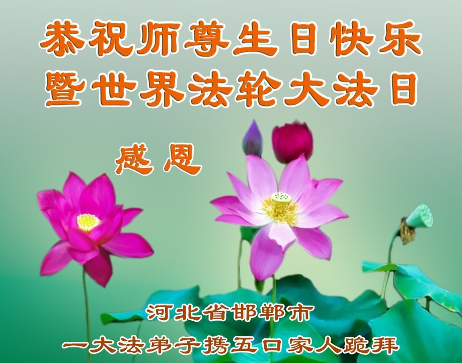 恭贺世界法轮大法日! 恭祝师尊生日快乐! 河北省邯郸市一大法弟子携五口家人敬上 河北省邯郸一大法弟子恭贺世界法轮大法日暨师尊生日快乐!