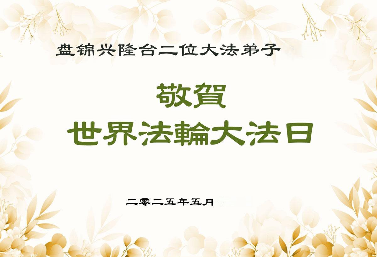 【明慧网二零二五年五月十二日】 辽宁盘锦兴隆台区二位大法弟子恭贺世界法轮大法日暨师父生日快乐!