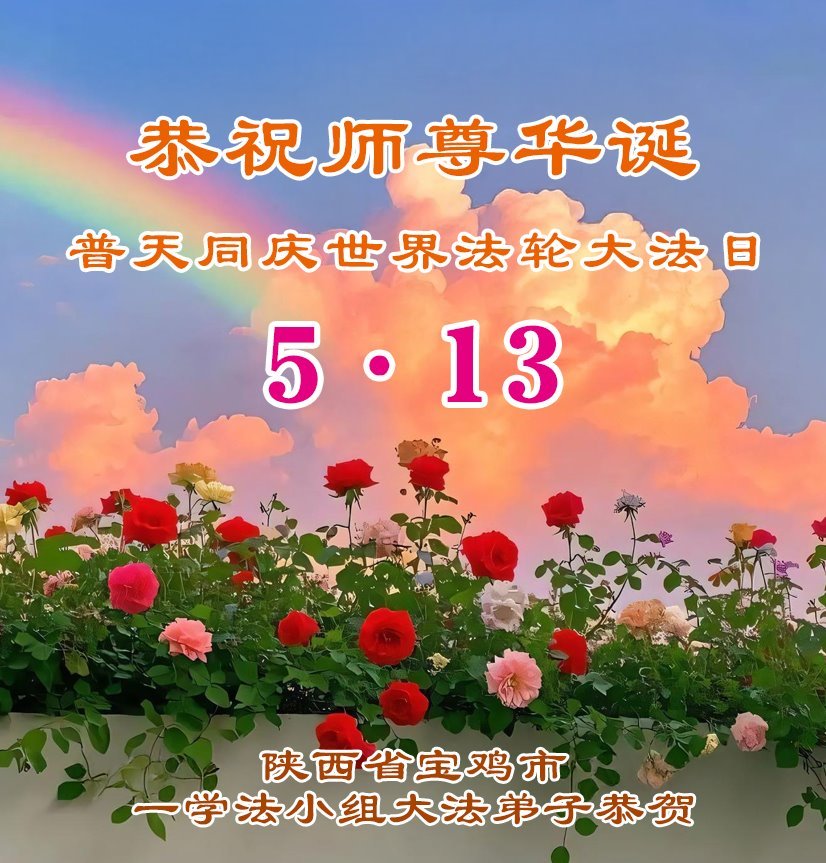 恭祝慈悲伟大的师尊生日快乐!敬贺世界法轮大法日! 感恩伟大的师父,感恩大法!坚定的维护师父,维护大法。弟子们唯有精進再精進,以此报恩,随师回家。 陕西省宝鸡市一学法小组大法弟子敬上 二零二五年五月三日 陕西省宝鸡市大法弟子敬贺世界法轮大法日!恭祝师尊生日快乐!
