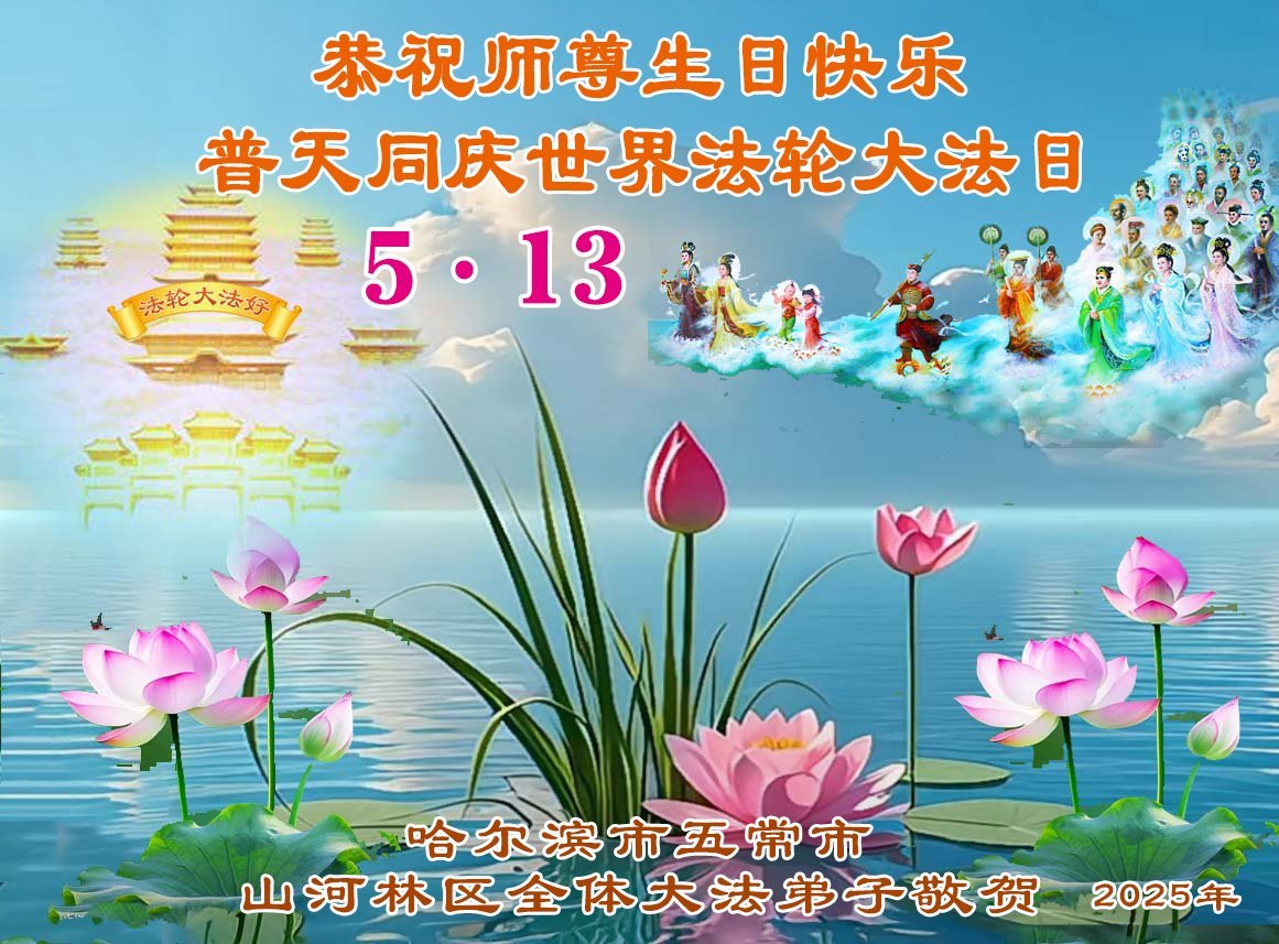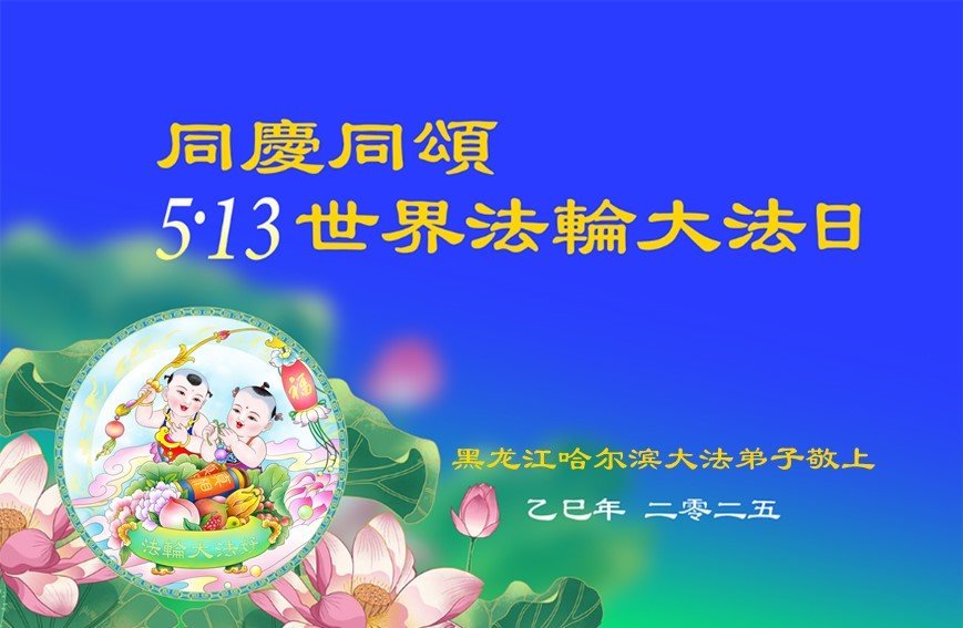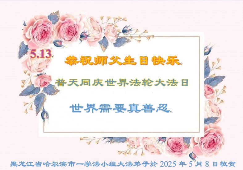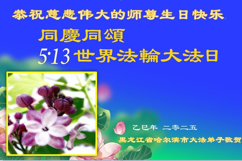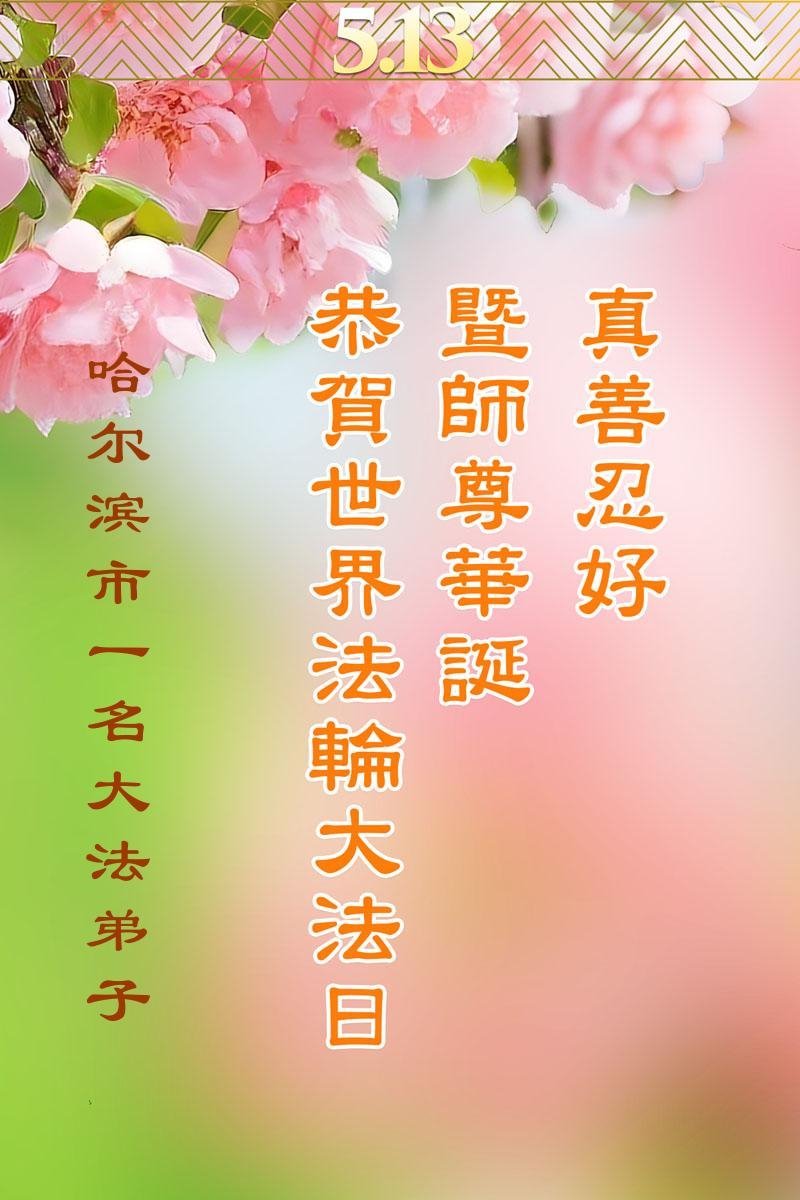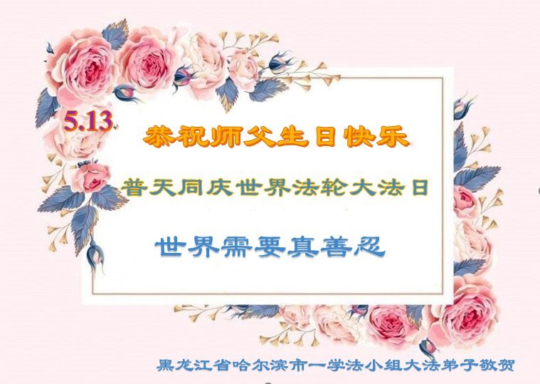 恭祝师尊生日快乐! 恭贺5.13世界法轮大法日! 恭贺法轮大法洪传三十三周年! 黑龙江省哈尔滨市一学法小组大法弟子敬上 黑龙江省哈尔滨一大法弟子恭贺世界法轮大法日!