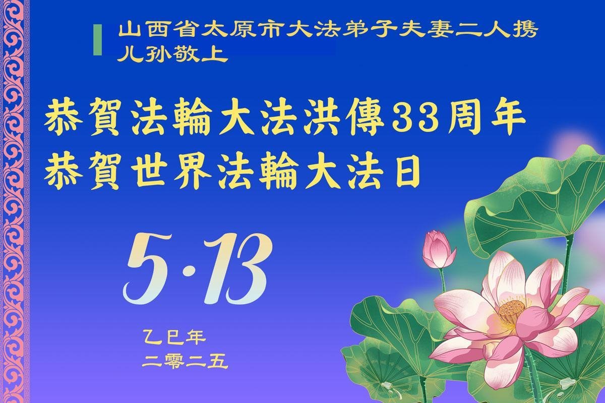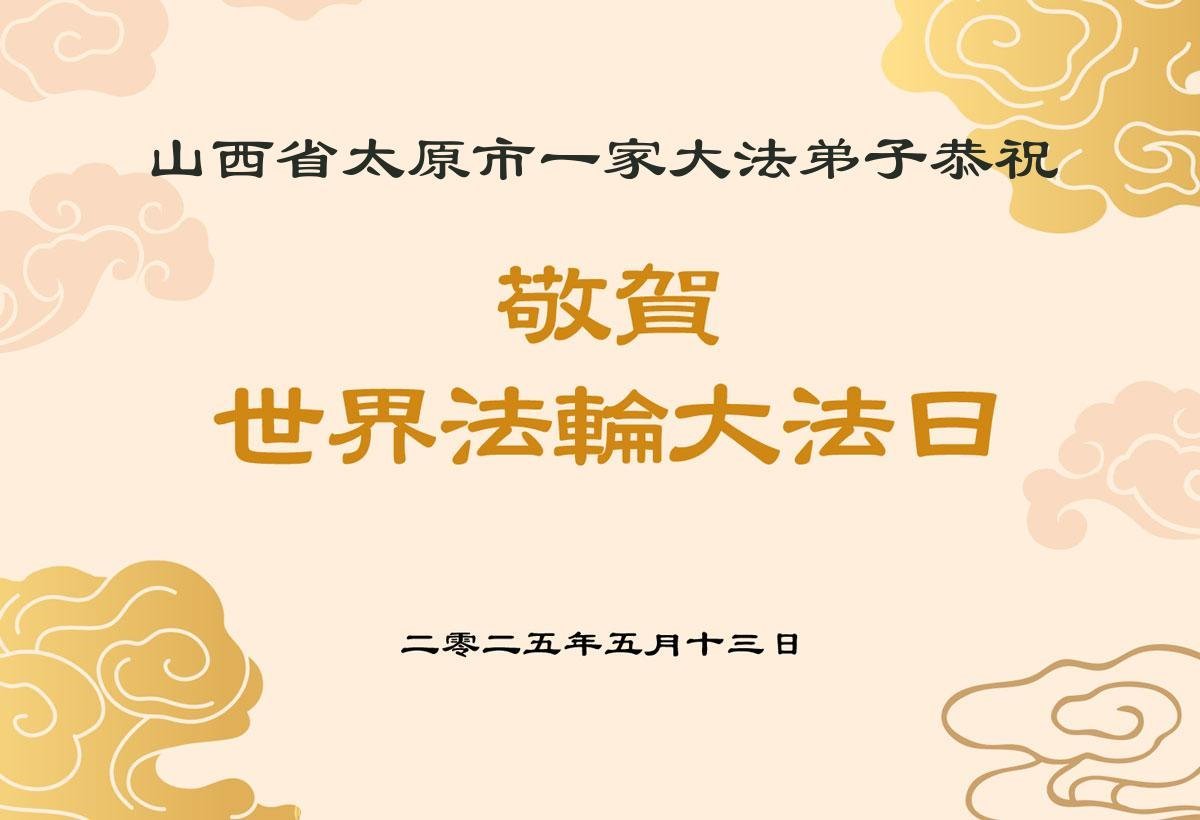 山西省太原市一大法弟子及家人恭贺世界法轮大法日!