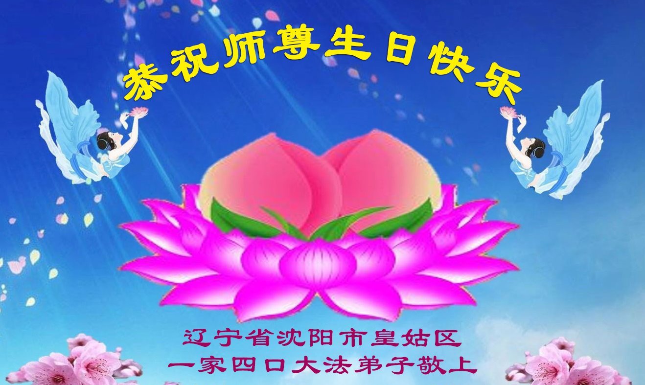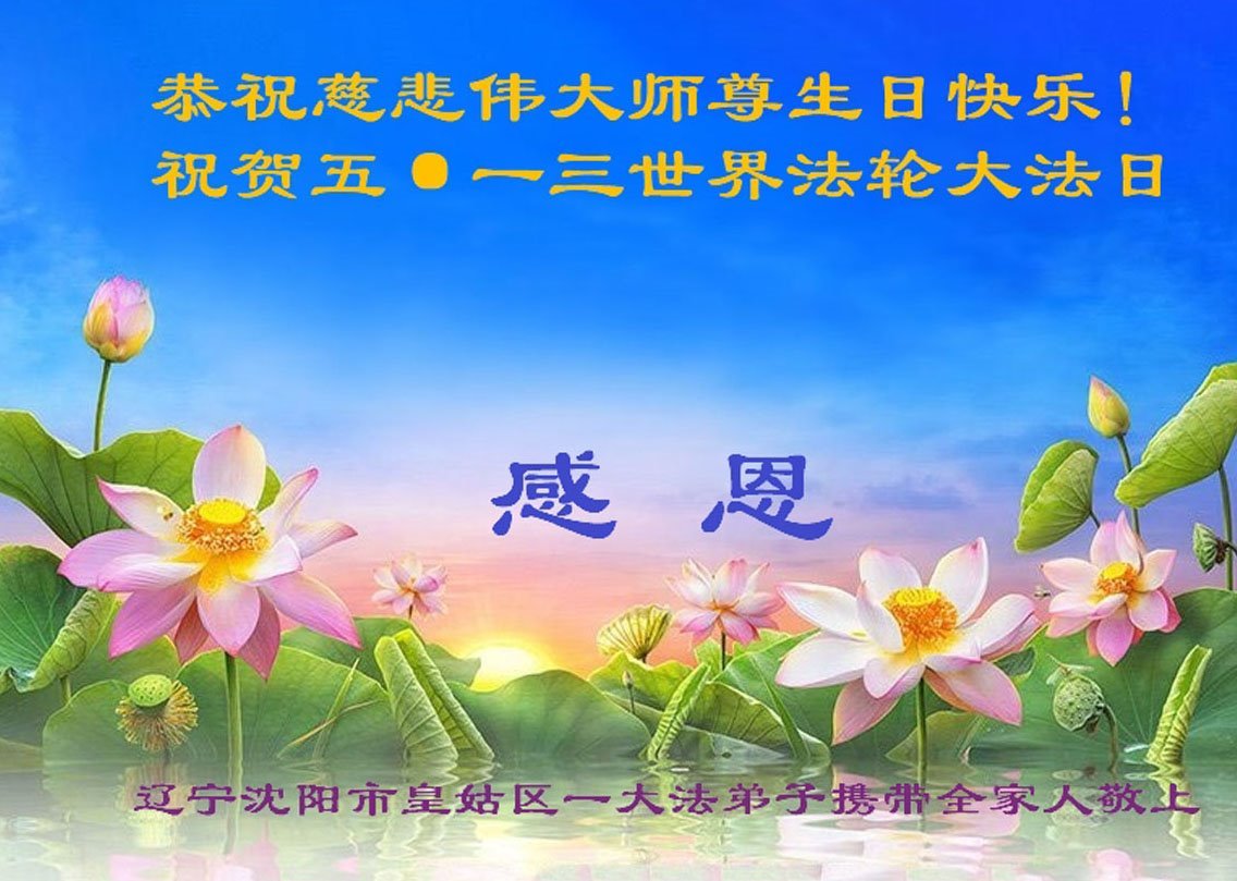 感恩师尊慈悲苦度!对师尊的感恩无法用语言表达,唯有精進实修,完成好使命,不负师恩! 辽宁沈阳市皇姑区一大法弟子携全家恭祝慈悲伟大师尊生日快乐!祝贺世界法轮大法日!