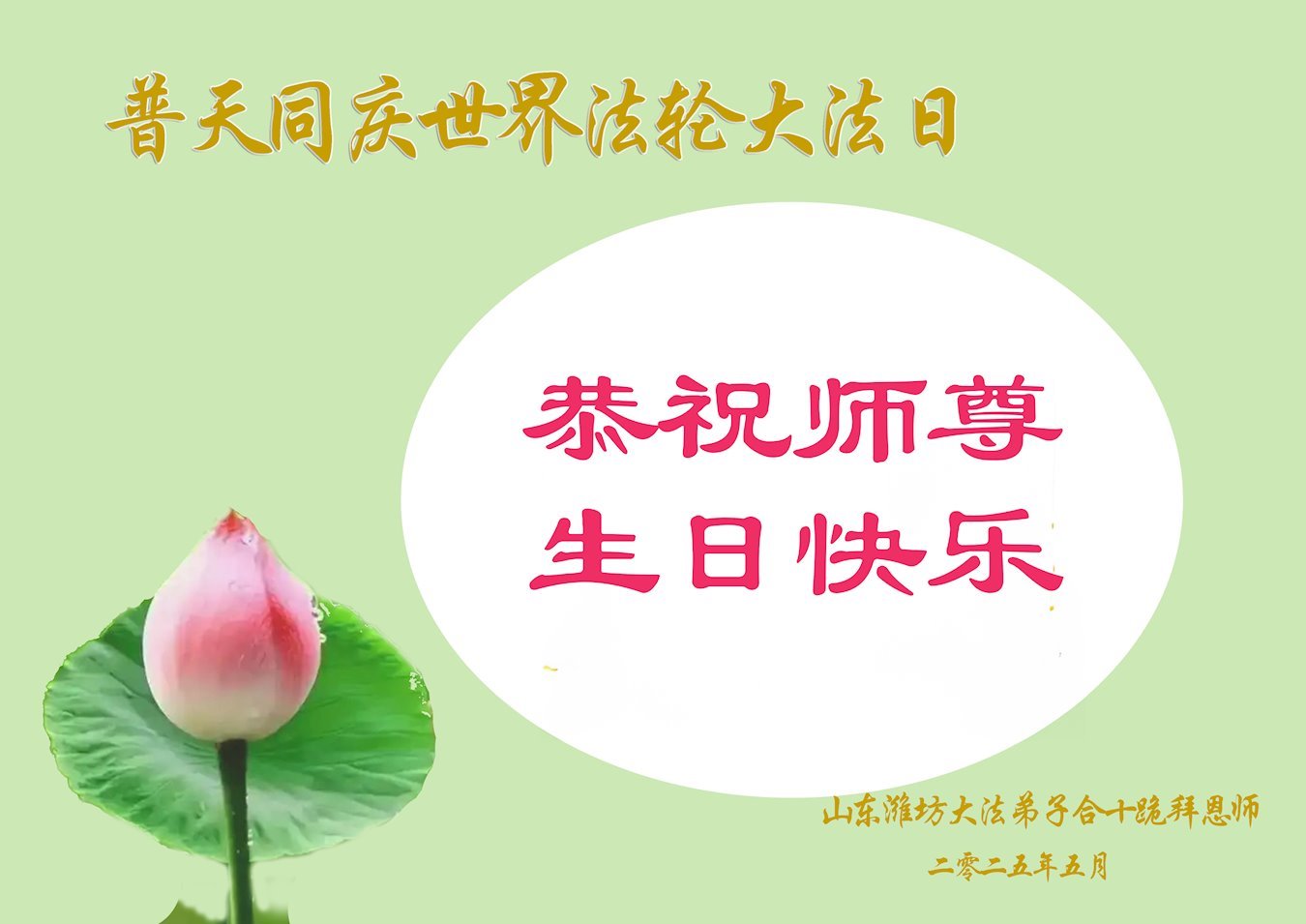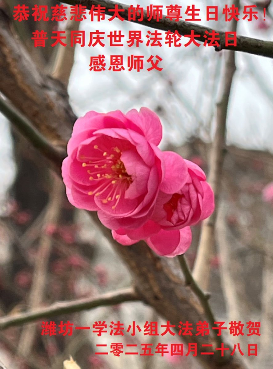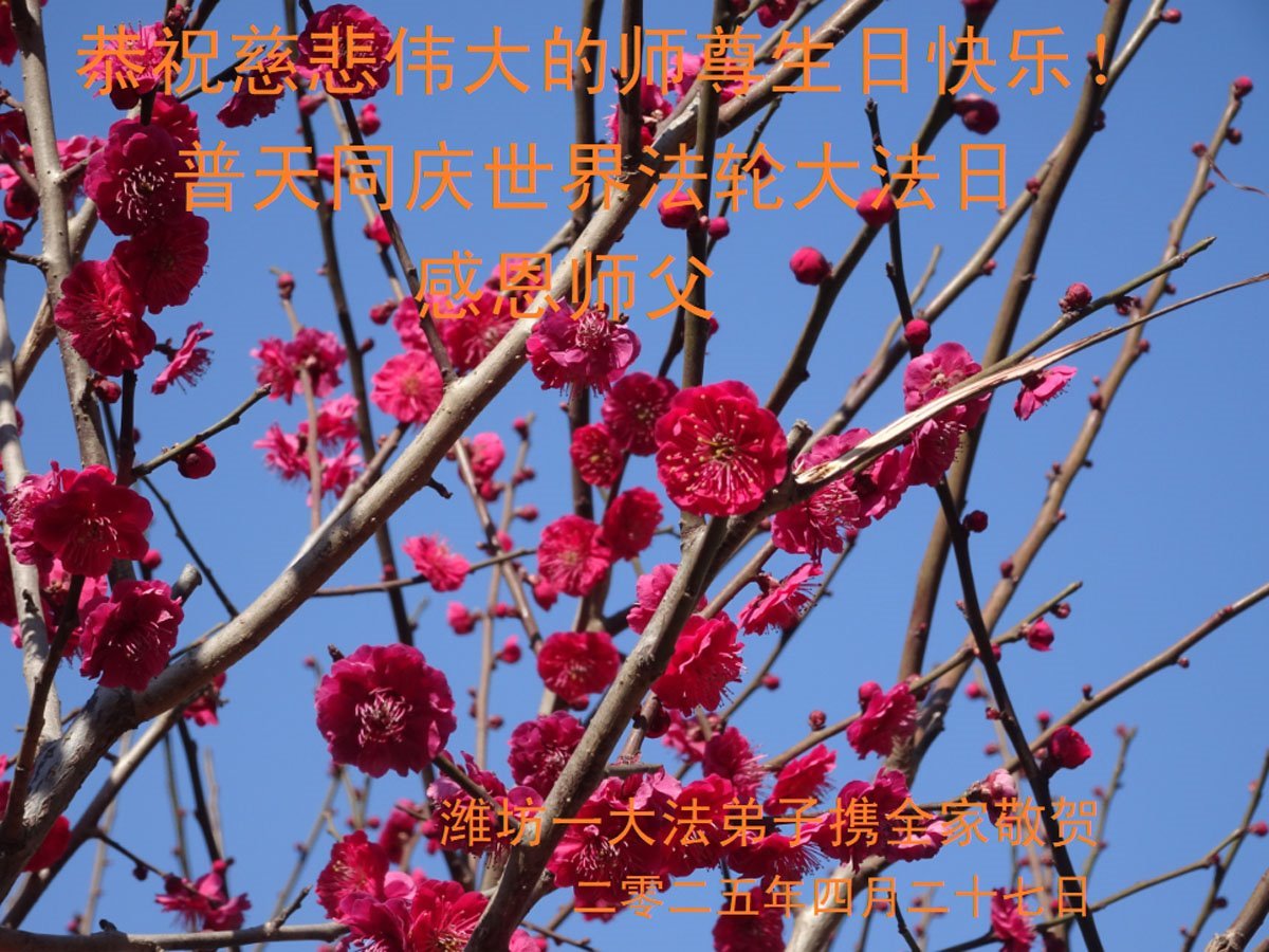 普天同庆、同颂世界法轮大法日!感恩师尊慈悲救度。 山东潍坊市五人学法小组大法弟子恭贺世界法轮大法日!恭祝师尊生日快乐!