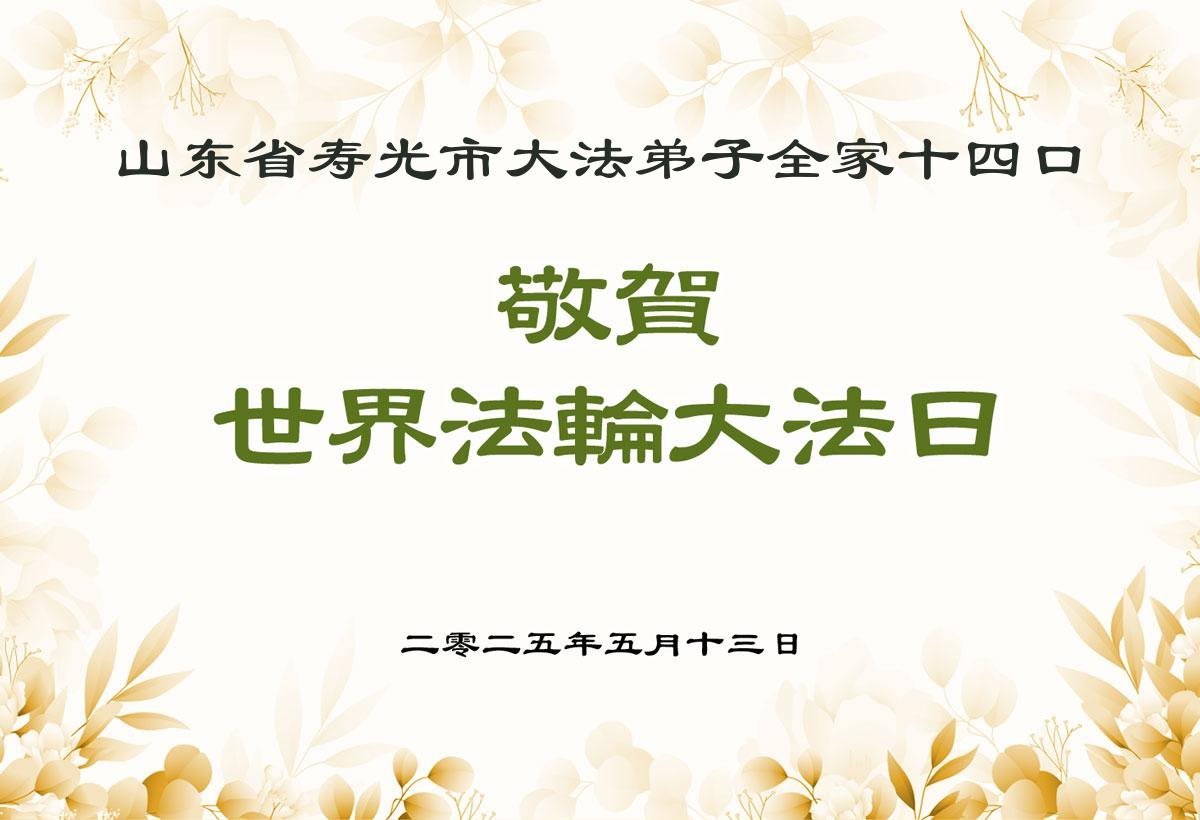 山东省潍坊市寿光市大法弟子全家十四口恭贺世界法轮大法日!