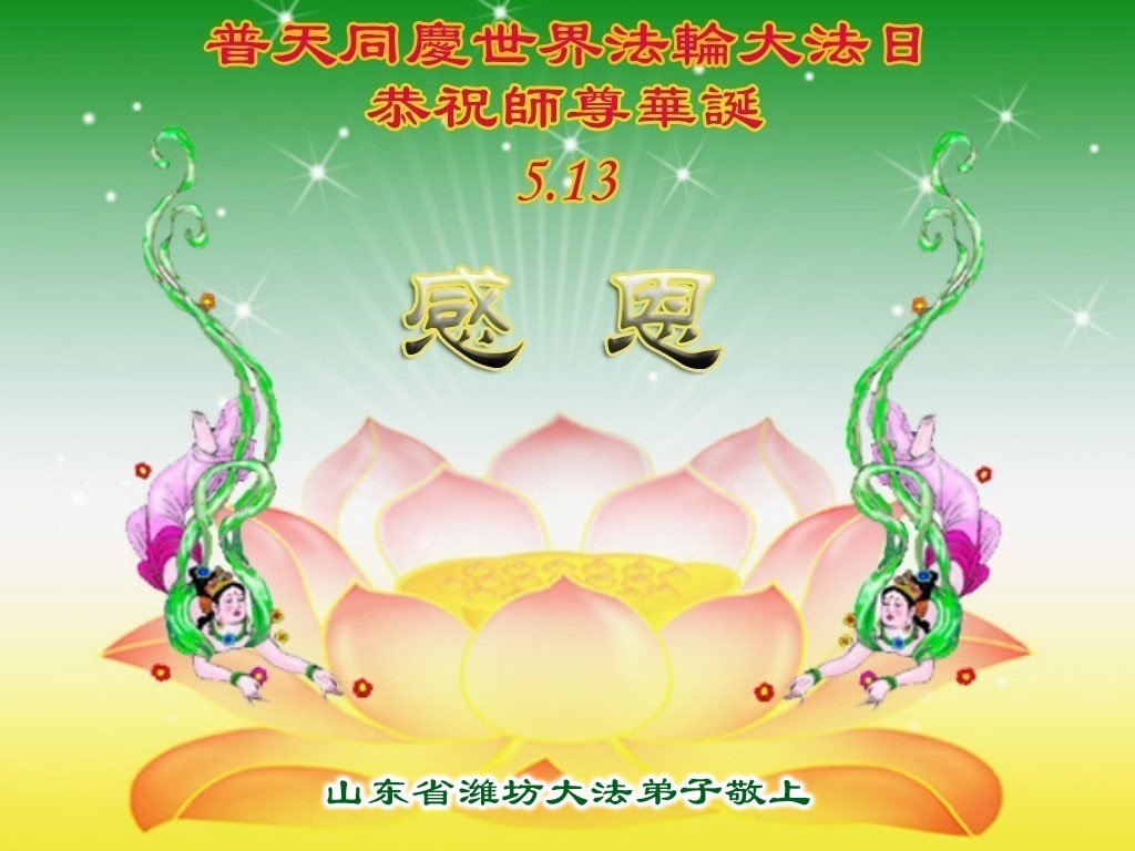 恭贺5·13世界法轮大法日!恭祝师父生日快乐! 在这普天同庆的盛大节日到来之际,我们这些沐浴在师父慈悲佛光三十余载的大法弟子,心怀万分感恩的心,献上我们真挚的祝愿:恭祝师尊生日快乐! 山东省潍坊大法弟子敬上 山东省潍坊大法弟子恭贺世界法轮大法日暨慈悲伟大的师父生日快乐!