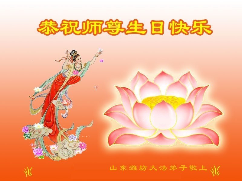 恭祝慈悲伟大的师父生日快乐!普天同庆世界法轮大法日! 感恩师尊慈悲救度,师恩浩荡!弟子用尽生命的永远都无法报答师父为众生的辛苦付出。师父您辛苦了!师尊的无上圣恩,弟子永记不忘。弟子会听师父的话,做好三件事。 山东省潍坊大法弟子敬上 山东省潍坊大法弟子恭贺世界法轮大法日暨慈悲伟大的师父生日快乐!