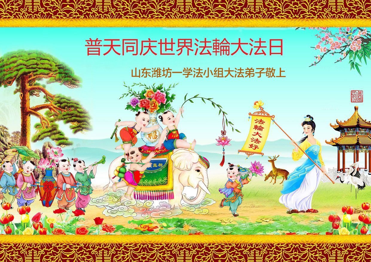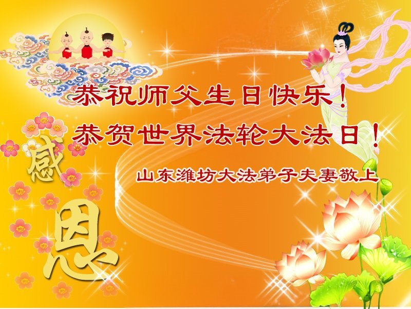 在普天同庆的时刻,我们更要修好自己,向内找,做好三件事,跟师尊回家。 山东潍坊市大法弟子夫妻敬上 山东省潍坊大法弟子恭贺世界法轮大法日暨师尊生日快乐!