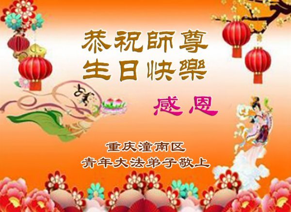 在普天同庆、大喜的日子即将到来之际,我们同精進学法小组全体大法弟子向慈悲伟大的师父致以最崇高的敬意!感恩师父慈悲救度!在剩下不多的时间里,学好法、修好自己、多救众生、完成好史前大愿,跟师父回到真正的家园。 重庆市沙坪坝区同精進学法小组全体大法弟子跪拜 重庆市面对面讲真相全体大法弟子恭祝师尊生日快乐!