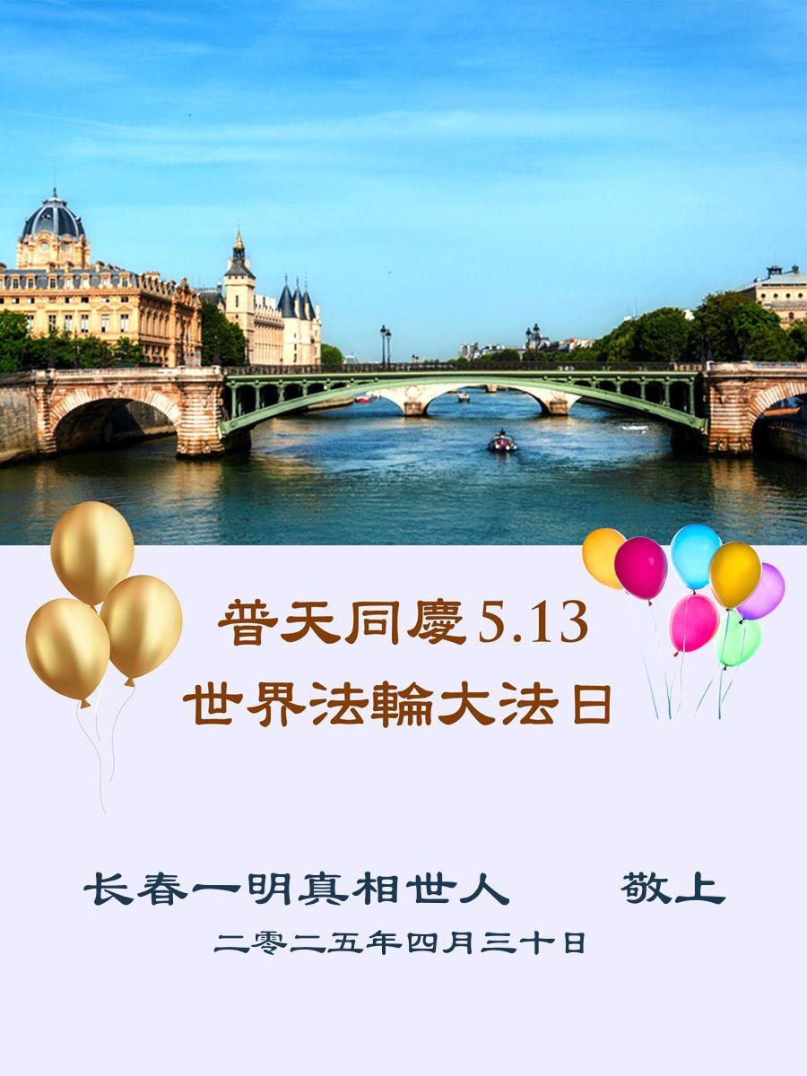 恭祝师尊生日快乐! 普天同庆、同祝、同颂513世界法轮大法日! 感恩师尊慈悲苦救! 吉林省长春一母女大法弟子敬上 二零二五年四月二十三日 吉林省长春市一明真相世人恭贺世界法轮大法日!恭祝慈悲伟大的师尊生日快乐!