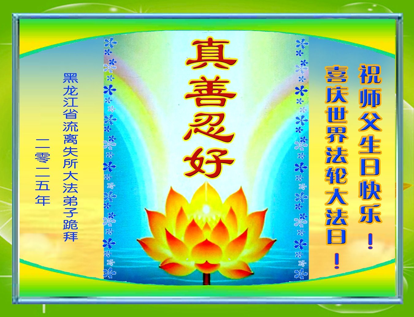 感恩师父救度,弟子铭记师恩,一定精進实修! 黑龙江省青年大法弟子敬上 黑龙江省流离失所大法弟子恭贺世界法轮大法日暨师父生日快乐!