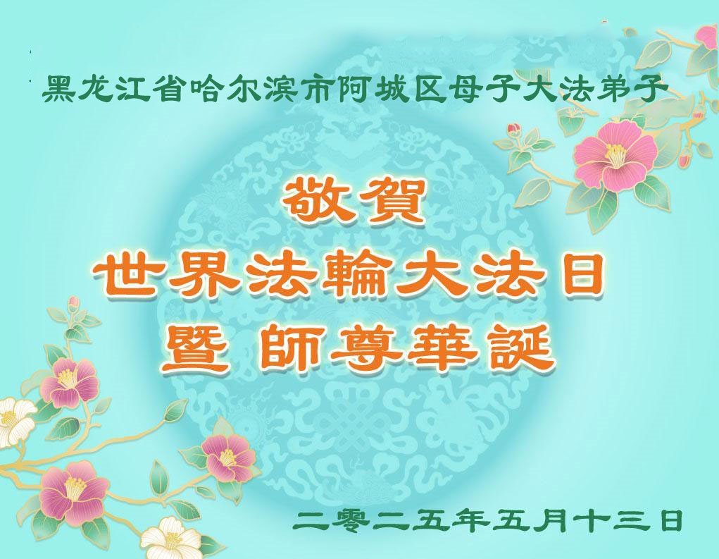 恭贺世界法轮大法日!恭祝师父华诞! 尊敬的师父好:世界法轮大法日马上就到了,弟子有太多的话要说,师父救我,帮我走过生死劫难,穷尽人类的语言也无法表达对师父的感恩,在此弟子叩拜师父,给了弟子第二次生命,谢谢师父救命之恩! 黑龙江伊春一大法弟子敬上 二零二五年 四月十八日 黑龙江省哈尔滨市阿城区母子大法弟子庆贺5.13世界法轮大法日!恭祝慈悲伟大的师尊生日快乐!