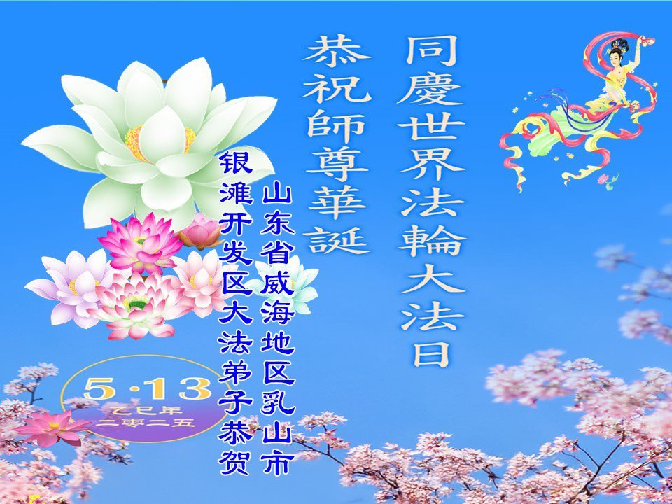 山东省威海地区乳山市银滩开发区大法弟子恭贺世界法轮大法日!