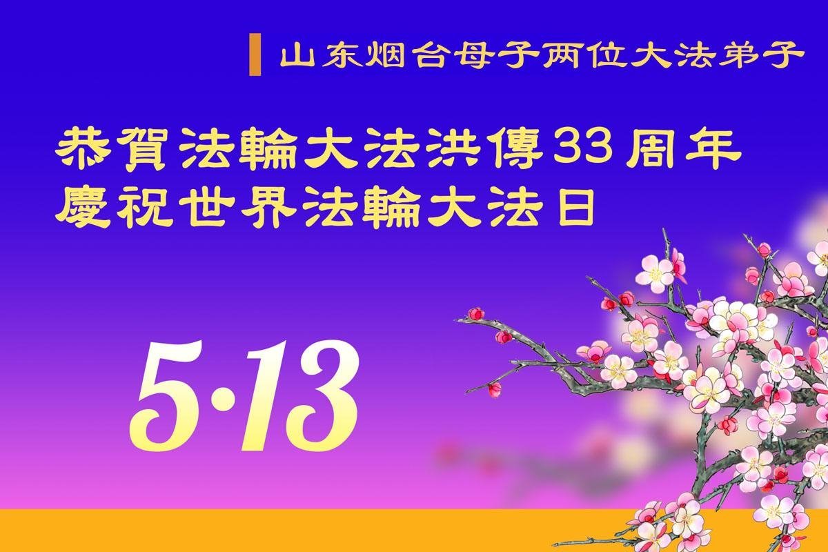 恭祝师尊生日快乐! 普天同贺513世界法轮大法日暨法轮大法洪传三十三周年! 弟子感恩大法师父的慈悲救度和一路看护。弟子今后一定要更加精進,认真实修,多救人。愿所有善良人都早日明真相,得到大法的救度,为自己选择美好的未来。 山东省淄博市三位大法弟子敬上 山东省烟台母子两位大法弟子恭祝师尊生日快乐!恭贺世界法轮大法日!