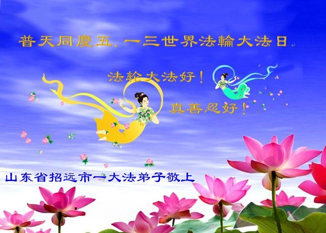 法轮大法好!真善忍好! 山东省烟台市招远市一讲真相小组大法弟子恭贺世界法轮大法日!