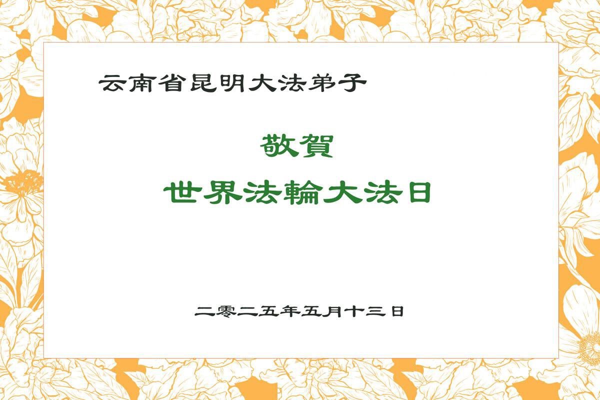 在世界法轮大法日来临之时,普天同庆!弟子怀着无比感恩的心情,跪拜慈悲伟大的师尊,恭祝师尊生日快乐!师尊辛苦了! 师尊给我们太多,我们做的太少。在助师正法的最后时刻,我们一定会更加精進,整体配合好,做好三件事。遇事向内找,时时添正念,圆满随师还! 云南省昆明三个学法小组大法弟子跪拜 二零二五年五月五日 云南省一大法弟子恭贺世界法轮大法日暨敬祝师尊华诞!