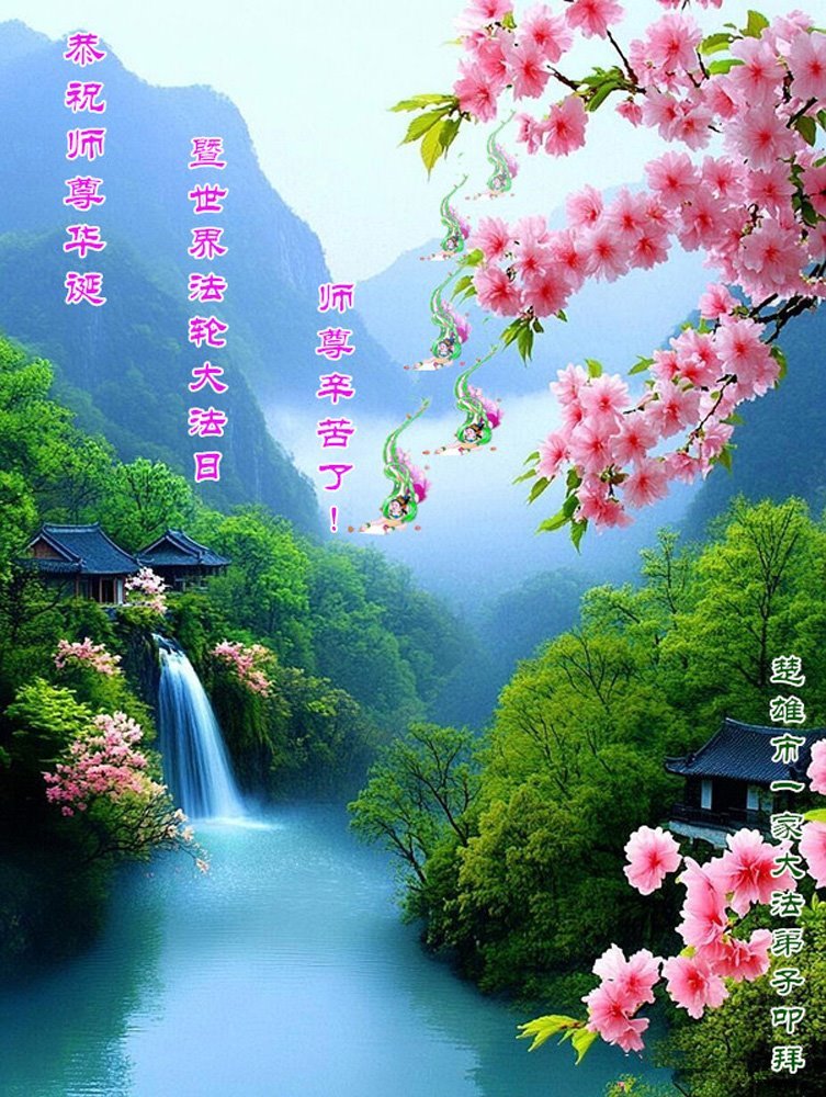 恭贺世界法轮大法日暨师尊华诞! 感恩师尊慈悲救度!师尊辛苦了! 云南省楚雄州楚雄市一家大法弟子叩拜 云南省红河州石屏县宝秀镇大法弟子恭贺世界法轮大法日!恭祝师尊生日快乐!