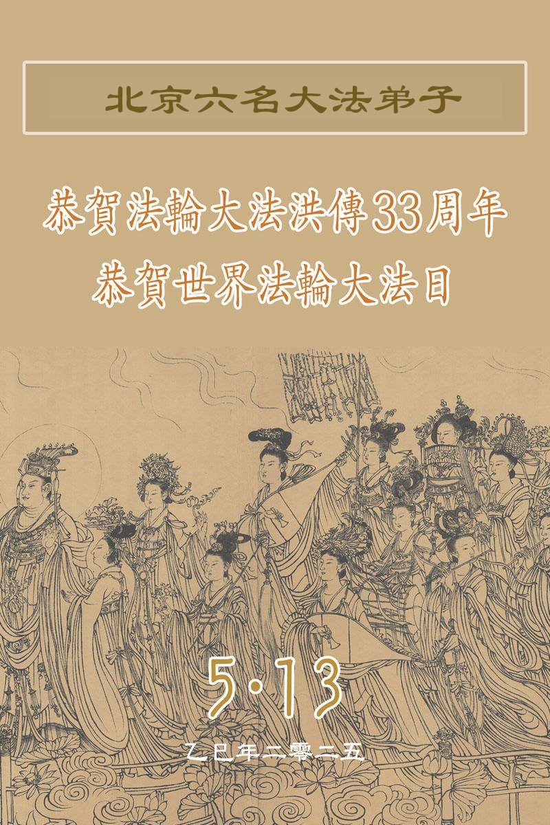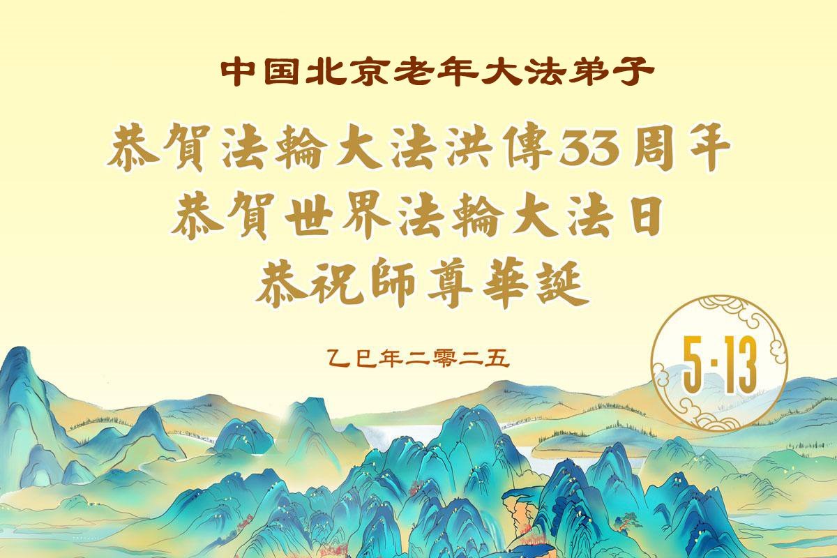 恭贺世界法轮大法日暨慈悲伟大的师尊生日快乐! 五一三日不平凡,圣王下世到凡间。 三十三年如一日,救度众生返家园。 邪恶迫害挡归路,大法弟子意志坚。 岂容坏人逞凶狂,天理不容神灵显。 善恶分明天即亮,众生快快上法船。 北京市昌平区老年大法弟子敬上 二零二五年五月一日 北京市门头沟区老年大法弟子恭贺世界法轮大法日!恭祝慈悲伟大的师尊生日快乐!