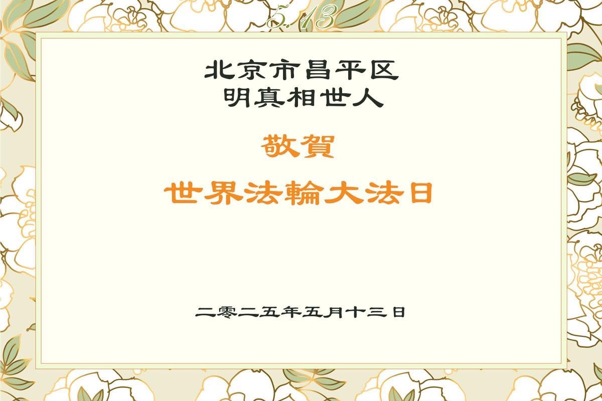 北京市昌平区明真相世人3人敬贺世界法轮大法日!祝愿李师父生日快乐!