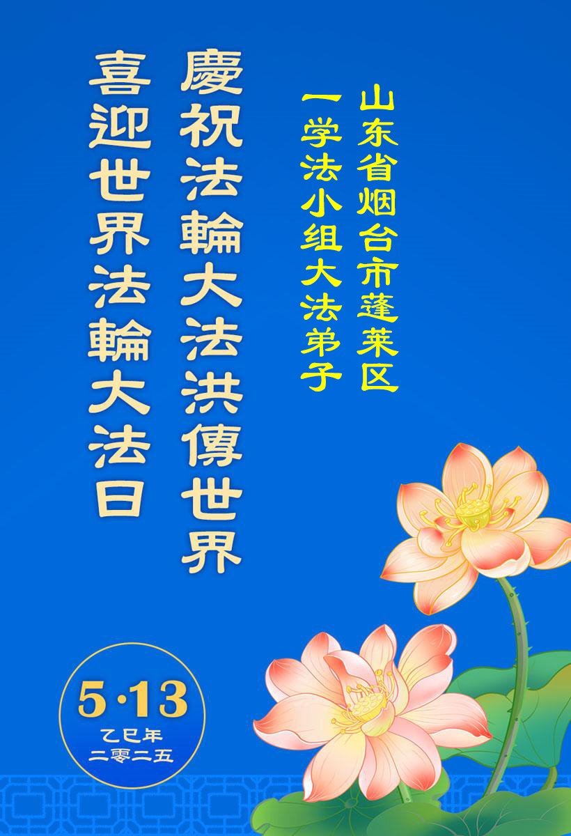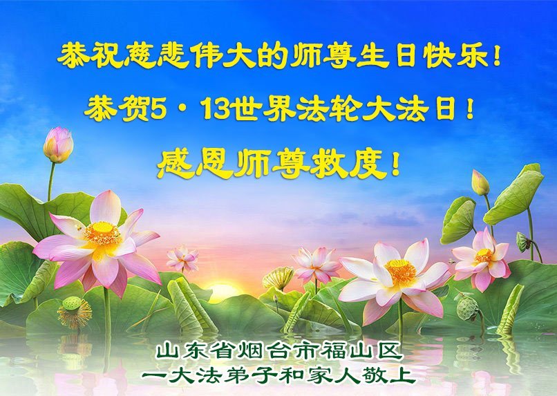 【明慧网二零二五年五月十二日】 山东省烟台市福山区一大法弟子和家人恭贺世界法轮大法日!
