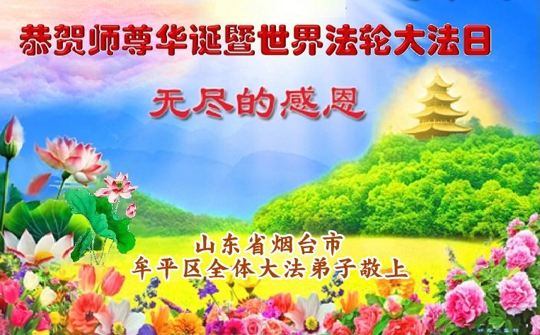 山东省烟台市福山区一学法小组恭贺世界法轮大法日暨敬祝师尊华诞!