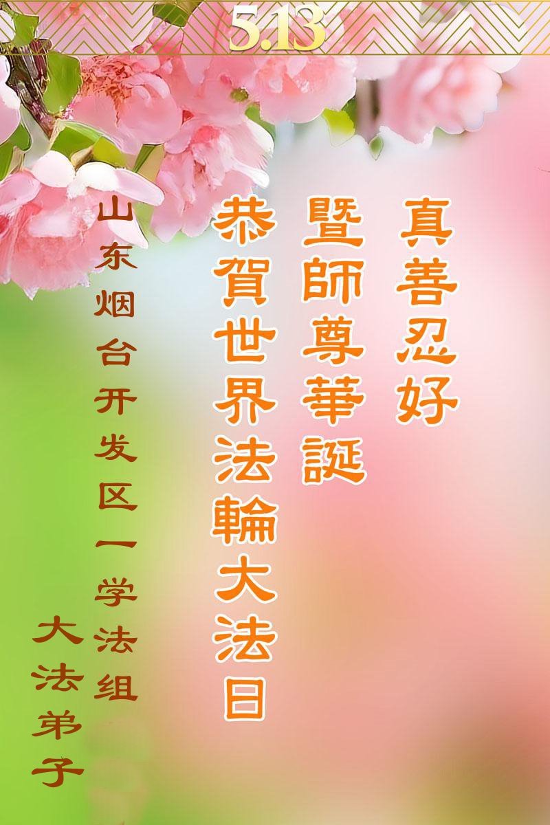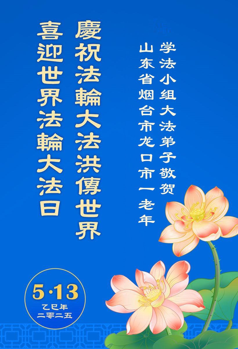 在普天同庆五·一三世界法轮大法日之际,恭祝慈悲伟大的师尊生日快乐! 今后我们唯有多学法,溶于法中,不断精進,做好大法弟子该做的三件事,讲清真相,救度众生,保持正念,信师信法永不变,才能完成好助师正法的历史使命!感恩师尊!感恩大法!叩拜师尊! 山东省烟台开发区一学法小组大法弟子敬上 二零二五年五月三日 山东省烟台市龙口市一老年学法小组大法弟子恭贺法轮大法日暨师尊华诞!