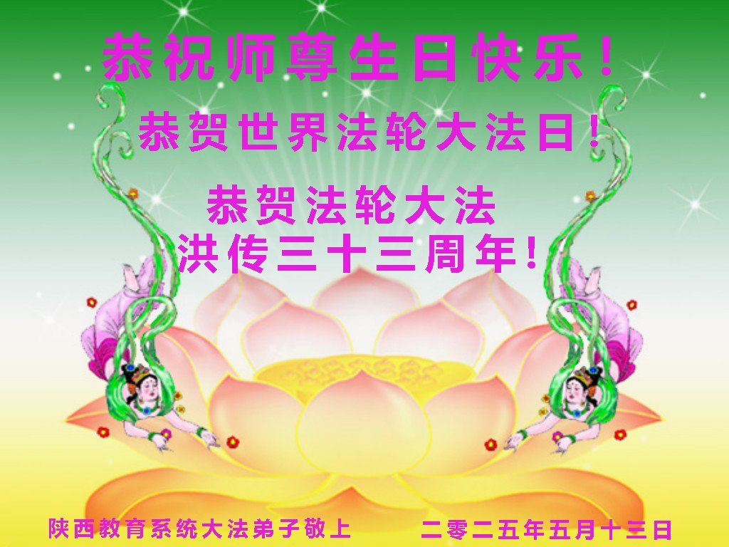 恭祝师父生日快乐!恭贺世界法轮大法日! 陕西省汉中市教育系统一退休大法弟子敬上 二零二五年四月二十日 陕西教育系统大法弟子恭贺世界法轮大法日暨慈悲伟大的师尊生日快乐!