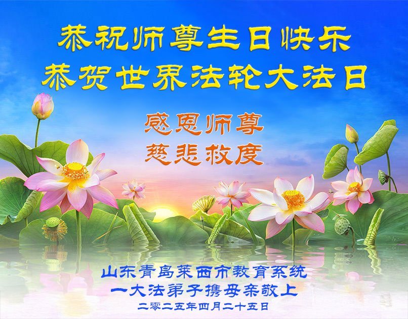 在世界法轮大法日来临之际,弟子们恭祝慈悲伟大的师尊生日快乐!恭贺五·一三世界法轮大法日!感谢伟大的师父慈悲救度!弟子们谨遵师尊的教诲,向内找去执著,做好三件事,跟师父回家。 陕西教育系统大法弟子敬上 山东青岛莱西市教育系统一大法弟子恭贺世界法轮大法日暨师尊生日快乐!