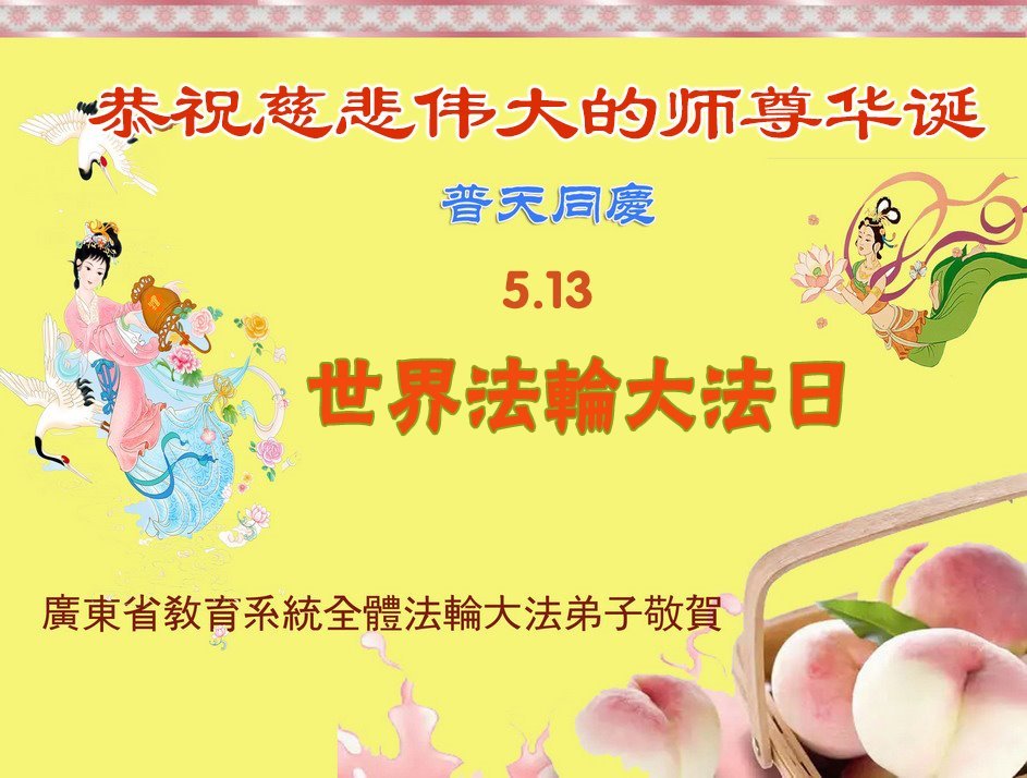 庆祝世界法轮大法日! 恭祝师尊生日快乐! 辽宁省抚顺市教育系统大法弟子敬上 二零二五年四月二十六日 广东省教育系统大法弟子恭祝慈悲伟大的师尊华诞!普天同庆5.13世界法轮大法日!