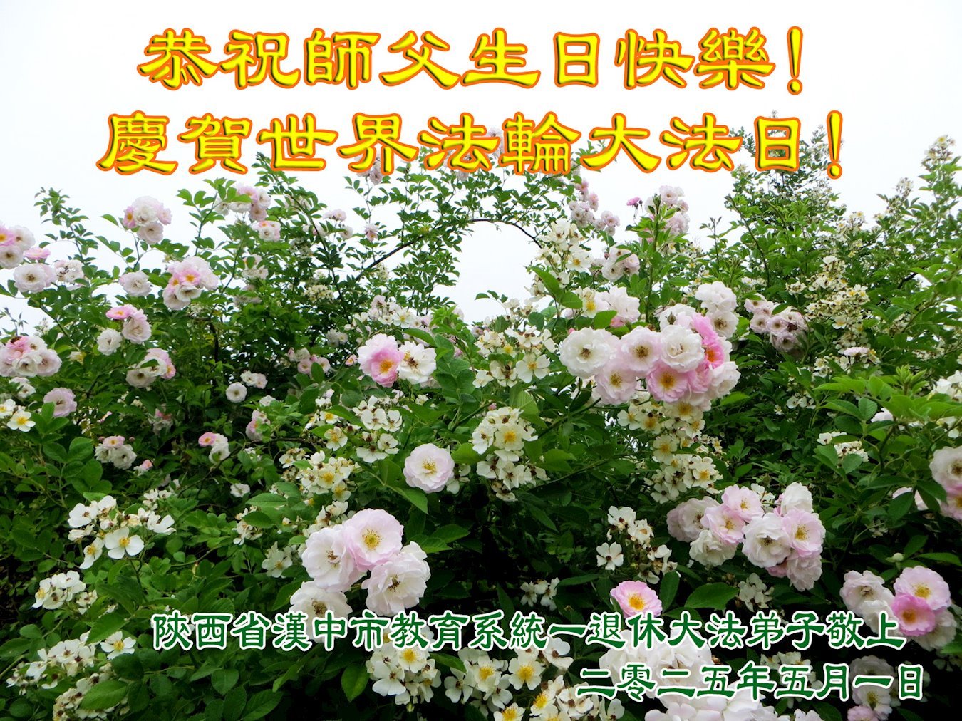 恭贺世界法轮大法日! 恭祝师父生日快乐! 陕西省汉中市教育系统大法弟子敬上 二零二五年四月二十日 陕西省汉中市教育系统一退休大法弟子恭祝师父生日快乐!恭贺世界法轮大法日!