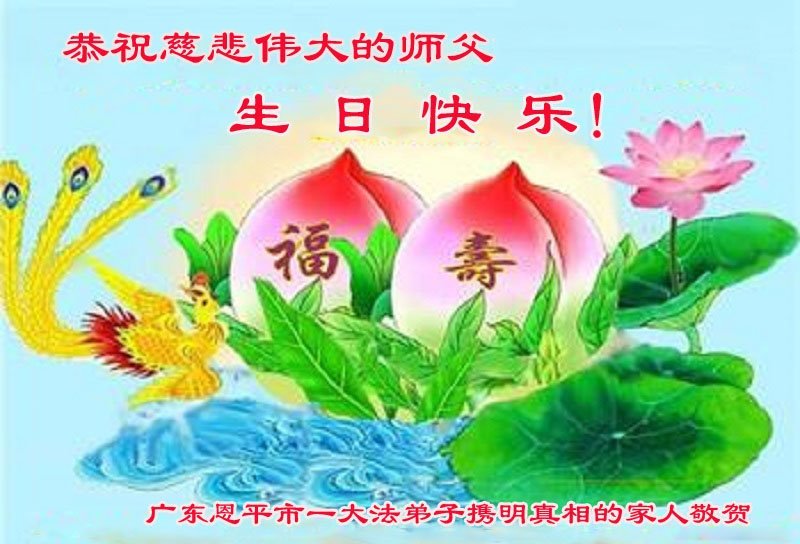 广东省江门市恩平市一大法弟子及明真相的家人恭祝慈悲伟大的师父生日快乐!