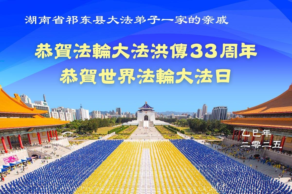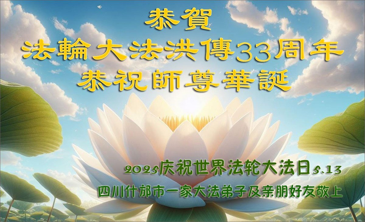 5.13世界法轮大法日是伟大而神圣的日子,是师尊降生人间的日子。从那一刻起万物复苏,众生开始觉醒。师父把宇宙大法“真善忍”传给了我们,才使众声明辨了善恶,找到了跟师父回家的路。弟子愿师父少一些操劳,多一些欣慰。感恩师尊,跪拜师尊! 河北保定阜平夫妻俩大法弟子携明白真相的家人敬上 二零二五年四月三十日 四川省德阳市什邡市一家大法弟子及亲友恭贺法轮大法洪传33周年暨师尊华诞!