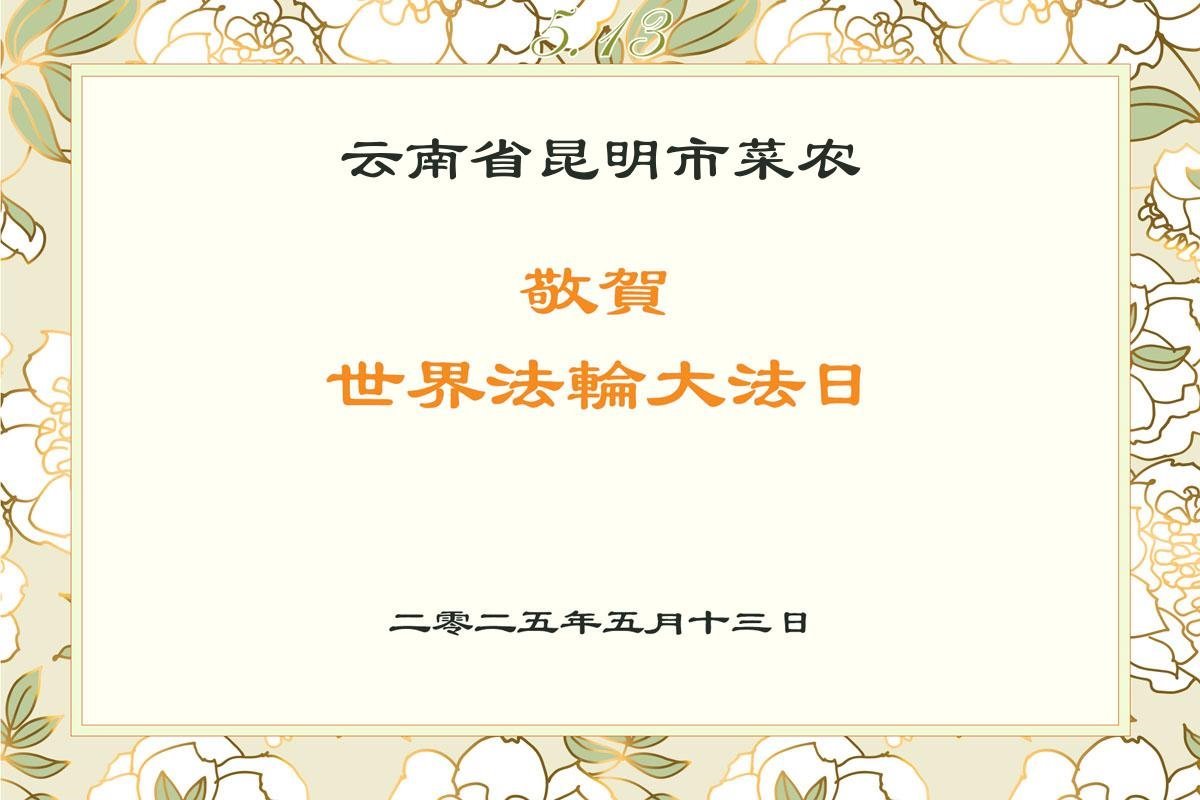 五月十三日,普天同庆日,恭祝师尊生日快乐!感恩师尊洪传大法三十三周年!恭贺世界法轮大法日!您的慈爱让我们明白了真相、懂得了生命的意义、知道了做人的标准、看到了未来的希望,感恩您的慈悲苦度!谢谢伟大的师父! 云南省昆明市一明真相菜农恭贺世界法轮大法日暨李大师生日快乐!