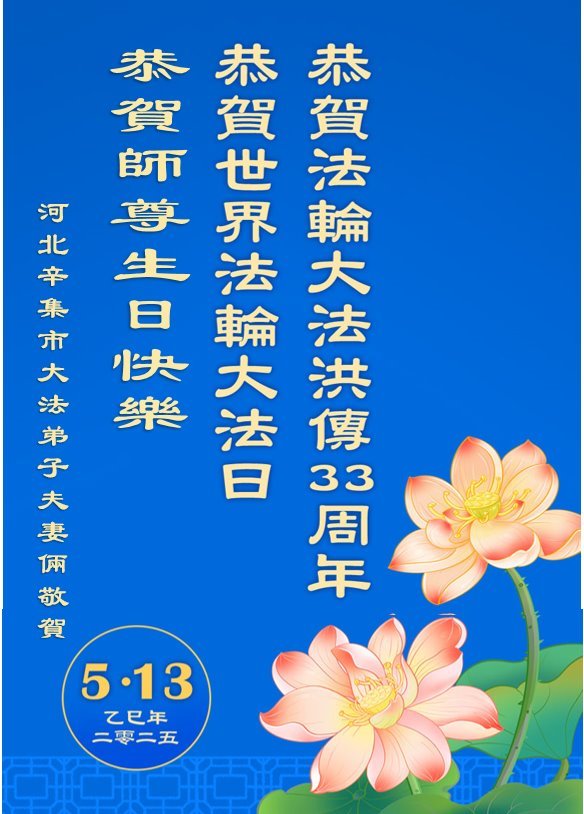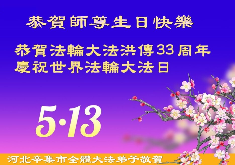 在这普天同庆的日子里,大法弟子叩拜师尊! 庆贺513世界法轮大法日暨法轮大法洪传三十三周年, 恭祝慈悲伟大的师尊生日快乐! 河北省石家庄新华区大法弟子敬上 2025年5月8日 河北省石家庄辛集市三大法弟子恭贺世界法轮大法日暨师尊生日快乐!