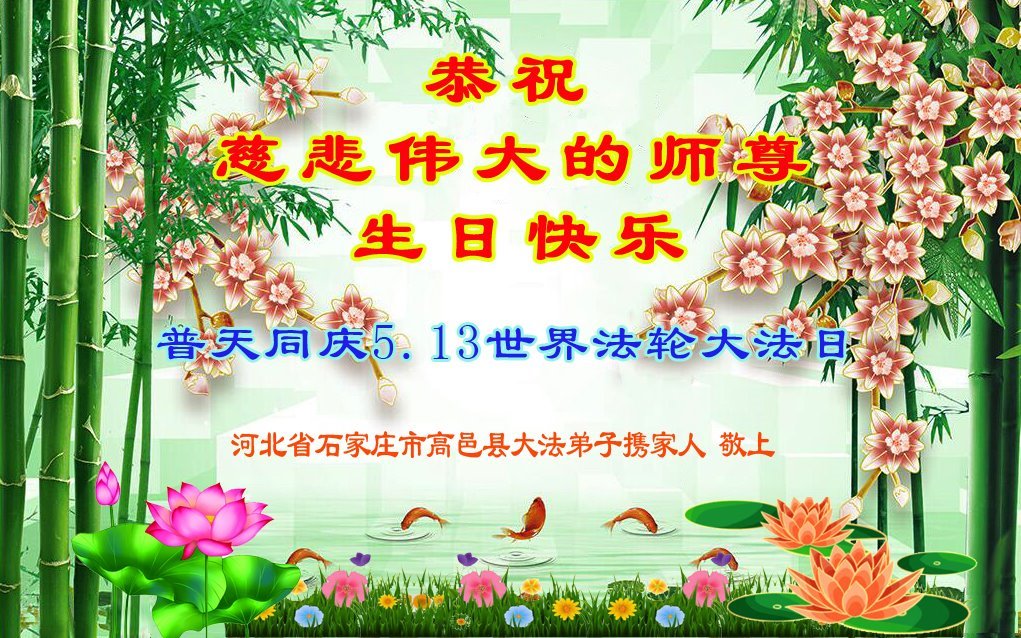 恭贺世界法轮大法日!恭祝慈悲伟大的师父生日快乐! 师父您辛苦了!弟子想念您。弟子要跟上正法進程,做好三件事,完成自己的历史使命。 期盼师父早日回国与大陆弟子们团聚。叩拜师父! 河北省保定市阜平县一大法弟子敬上 河北石家庄建明小区大法弟子携家人恭贺世界法轮大法日!