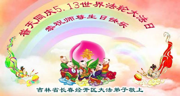 庆贺五一三世界法轮大法日!法轮大法好! 真善忍好! 恭祝师尊生日快乐!弟子要多救人,多学法。随师回家 吉林省长春经开区大法弟子敬上 吉林省长春经开区大法弟子恭贺五一三世界法轮大法日暨师尊生日快乐!
