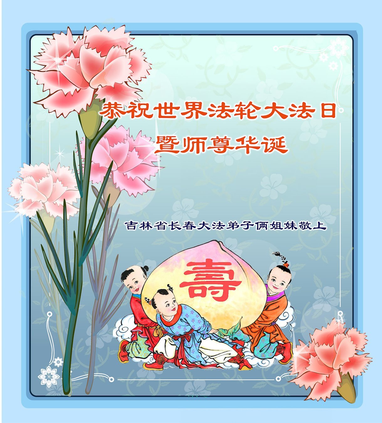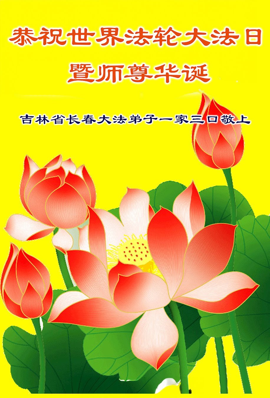 恭祝师尊生日快乐!恭贺世界法轮大法日!感谢师尊慈悲苦度! 吉林省长春市三姐妹及家人敬上 吉林省长春市榆树市俩大法弟子敬贺世界法轮大法日暨师父华诞!
