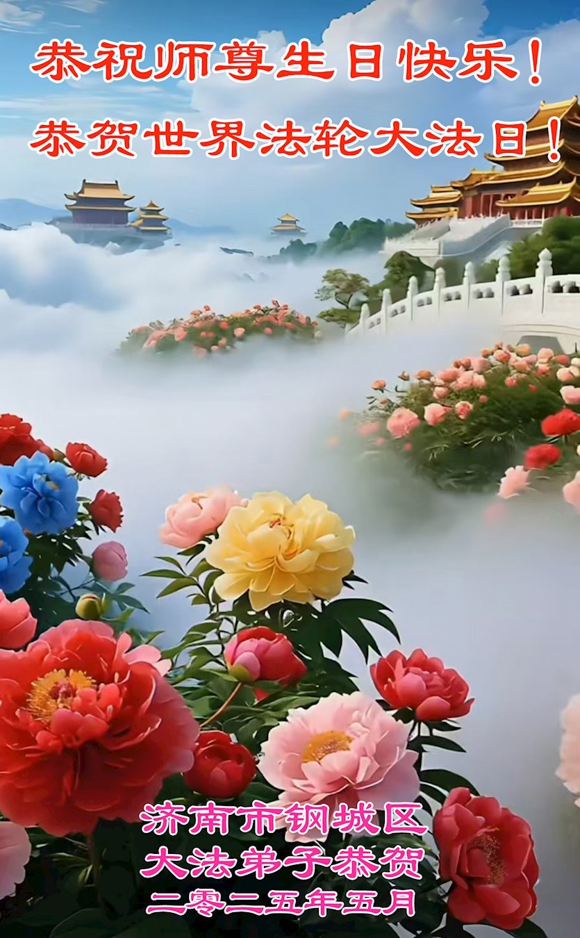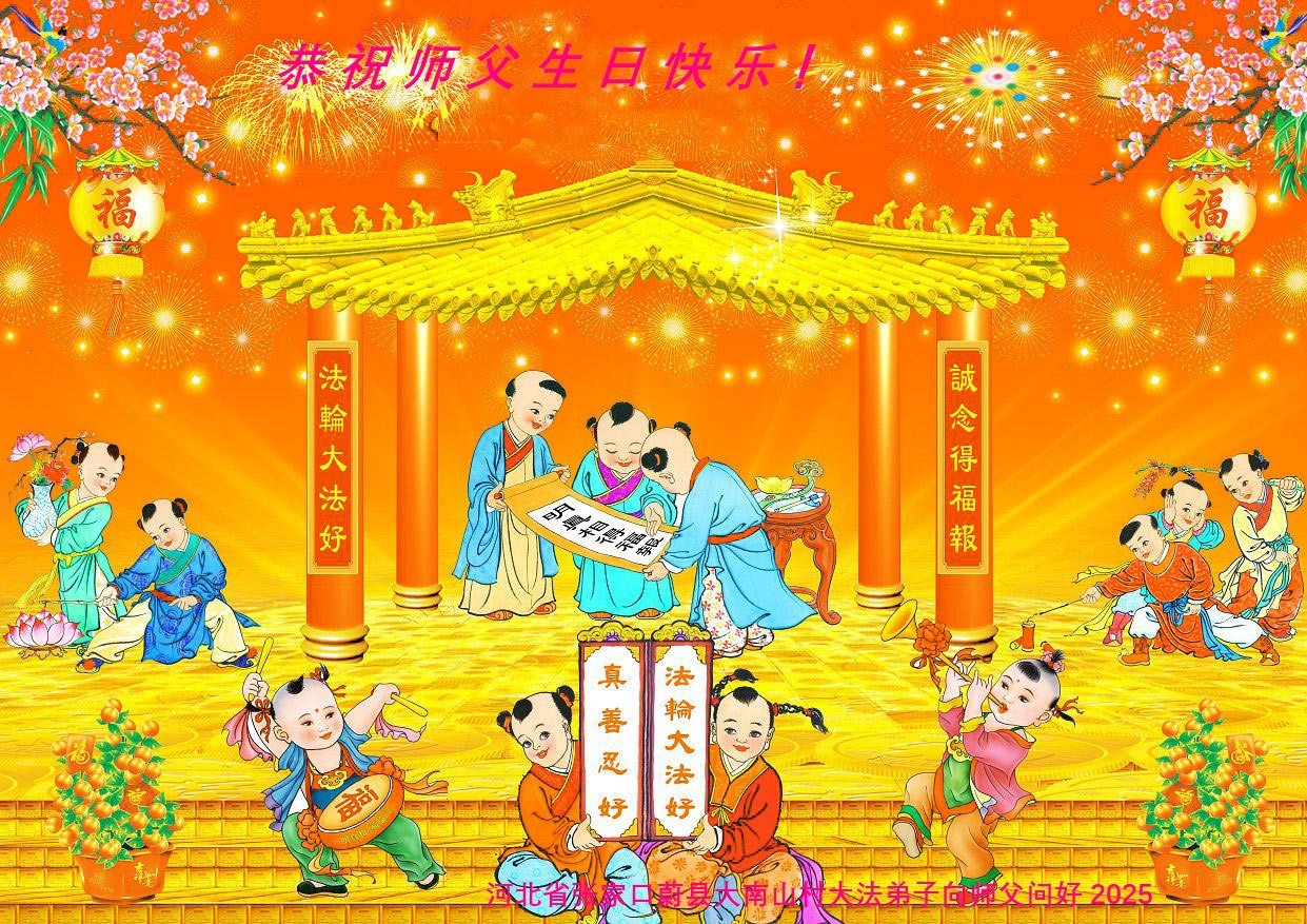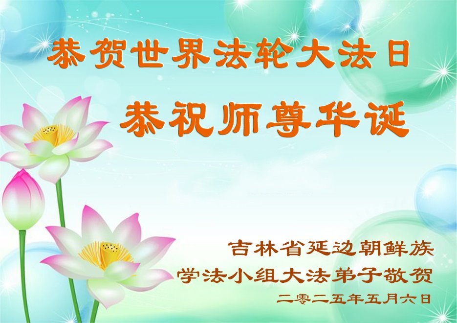 | 【明慧网二零二五年五月十二日】(明慧网记者综合报道)遍布中国大陆31省级地区的大法弟子们庆祝大法洪传33周年!恭贺师尊74岁华诞!慈悲伟大的李洪志师尊用真善忍的法理唤醒弟子们的本性,一年又一年,恩师引领着弟子们走过风雨交加的岁月,以最大的慈悲救起为法而来的宇宙苍生。值此普天同庆的时刻,弟子们深深叩拜恩师! 福建省宁德市大法弟子说:师父洪传宇宙大法,弟子才得知人生的意义,才能在这道德崩溃的乱世中守住正念。 吉林延边母女大法弟子写道:这一路走来有彷徨、有执著,但是师尊从来没有放弃弟子,一次次的把弟子从迷途中拉回来,在最黑暗的日子里,师父为弟子点亮了前行的路。 山东济南大法弟子表示:红尘末世,幸遇师尊普度!每个大法弟子和明白真相的世人都沐浴在师尊的佛恩浩荡中,活的踏实幸福。我们会让更多的世人明白真相,有一个选择美好未来的机会。 内蒙古巴彦淖尔市学法小组大法弟子写道:我们一定要努力的做好三件事,救度更多的众生,让新宇宙繁荣、昌盛。 以下为来自中国大陆22个省、5个自治区、4个直辖市大法弟子们的部份贺词贺卡,欢庆第26届世界法轮大法日! 吉林省延边朝鲜族学法小组大法弟子恭贺世界法轮大法日暨敬祝师尊华诞!