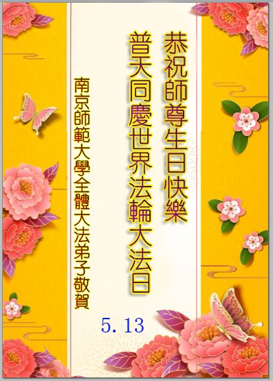 重庆大学大法弟子同庆5.13世界法轮大法日!恭贺法轮大法洪传世界三十三周年!叩谢师父的无量慈悲! 重庆大学大法弟子叩拜恩师 江苏南京师范大学全体大法弟子恭祝慈悲伟大的师尊生日快乐!
