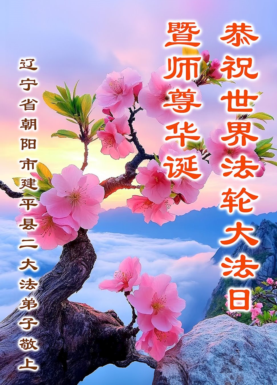 世界法轮大法日到来之际,恭祝伟大慈悲的师父生日快乐! 师父您辛苦了!弟子感恩师父的慈悲救度,盼望师父早日归来、神韵早日回大陆演出。弟子一定多学法、学好法,努力做好三件事! 辽宁省朝阳市建平县大法弟子恭贺世界法轮大法日暨敬祝师尊生日快乐!