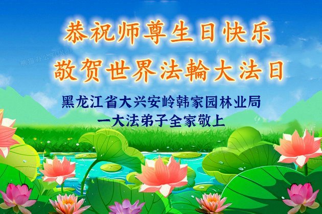 我们一定要学好法,修好自己,做好三件事。 黑龙江省大兴安岭韩家园林业局一大法弟子全家恭贺世界法轮大法日暨敬祝师尊生日快乐!