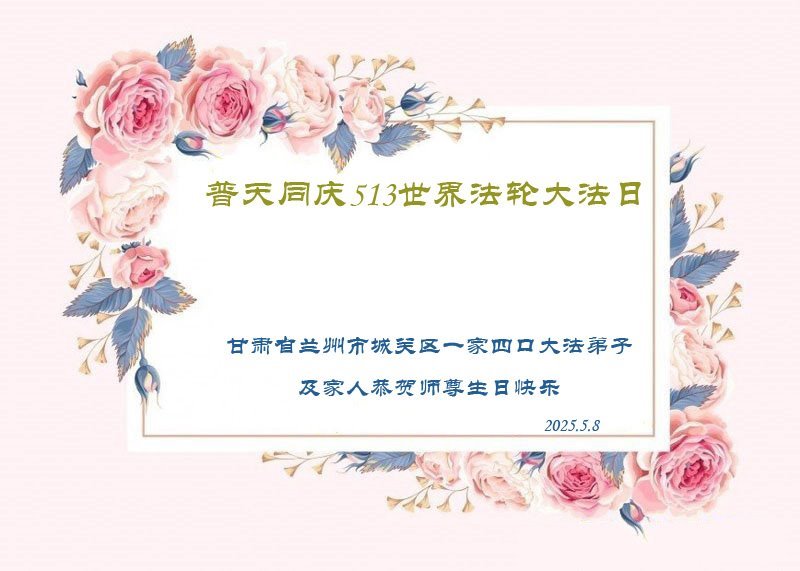 祝师尊生日快乐!在最后的时间,弟子唯有勇猛精進,实修,做好三件事,跟师尊回家。弟子真的很想师父,盼早日可以和师父团聚。感恩师尊的慈悲苦度,师父您辛苦了,合十。 甘肃省兰州市一大法弟子敬上 二零二五年五月七日 甘肃省武威市凉州区一学法小组大法弟子恭贺世界法轮大法日!