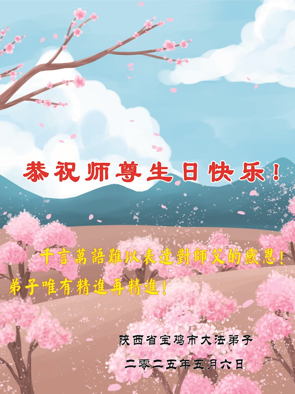 在师父华诞暨5.13世界法轮大法日来临之际,恭祝师父生日快乐! 尊敬的师父好,您的教诲弟子永记在心,弟子一直用心学法、不断领悟,收获颇多,师父的慈悲看护,弟子无以回报。誓愿认真听师父的话,做好三件事,把法轮大法的美好讲给世人;遇事向内找,多去执著心,精進实修,走好师父安排的路,做一个合格的大法弟子。感恩师父慈悲救度!弟子跪拜师父。 陕西省宝鸡市一大法弟子叩拜 2025年4月29日 陕西省宝鸡市一大法弟子恭贺五一三世界法轮大法日暨慈悲伟大的师尊生日快乐!