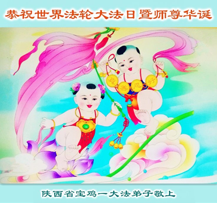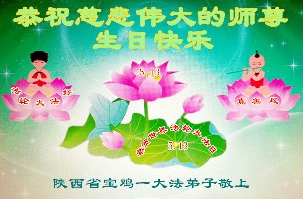 恭祝师父生日快乐!恭贺五·一三世界法轮大法日! 有幸修炼法轮大法,弟子内心充满喜悦,我学法、炼功、发正念,三件事都能跟上。弟子自知还有很多人心没有修掉,今后一定抓紧时间多学法、去执著,放下人心、观念,多救人,做好三件事,跟师父一起回家。 陕西省宝鸡一大法弟子敬上 陕西省宝鸡市一大法弟子恭贺513世界法轮大法日暨师父华诞!