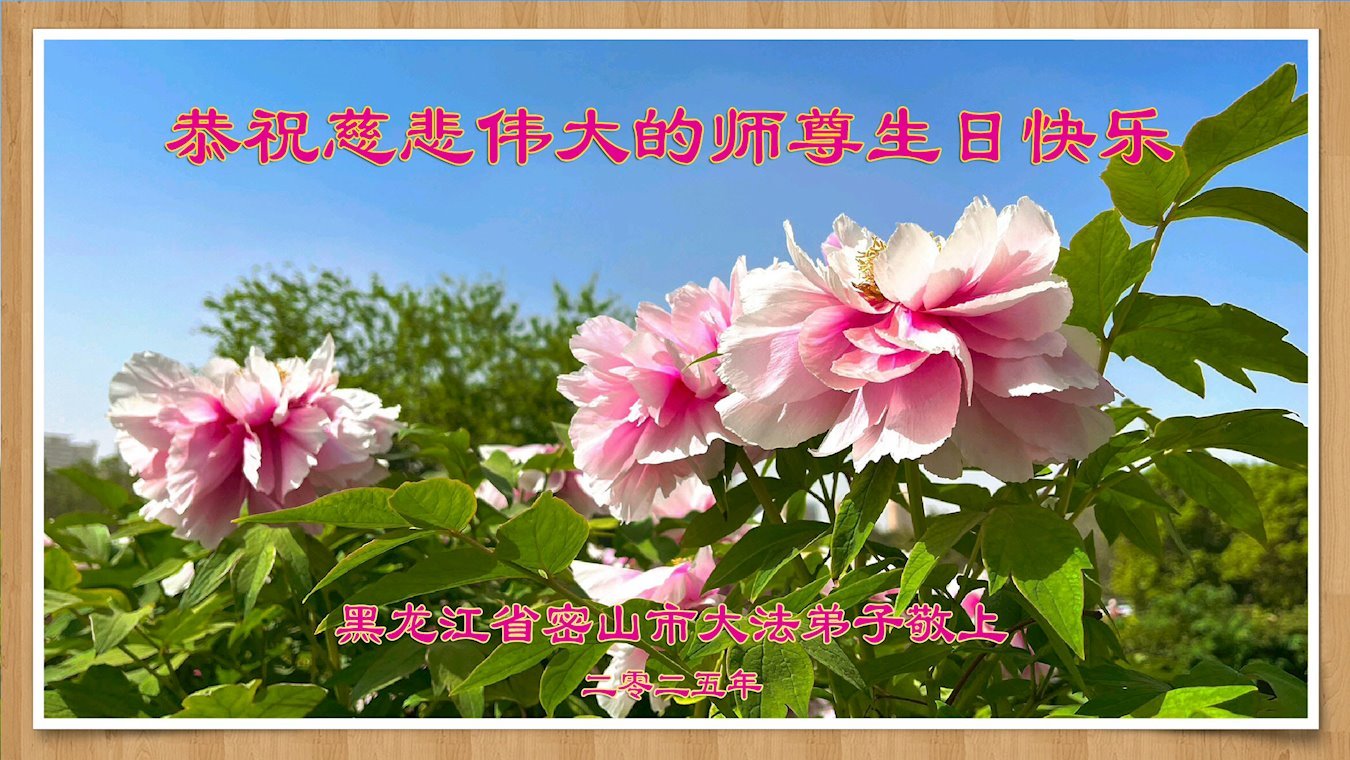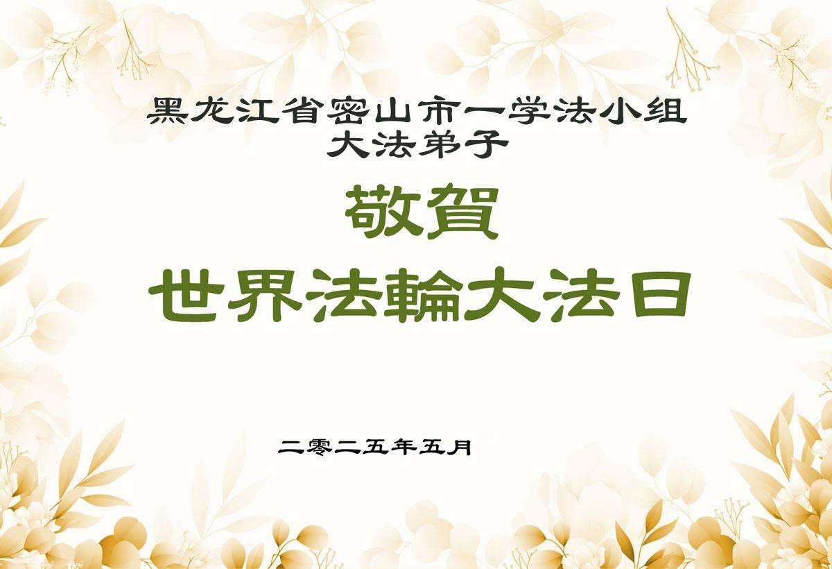 【明慧网二零二五年五月十三日】 黑龙江省鸡西市密山市大法弟子庆贺世界法轮大法日!恭祝慈悲伟大的师尊生日快乐!