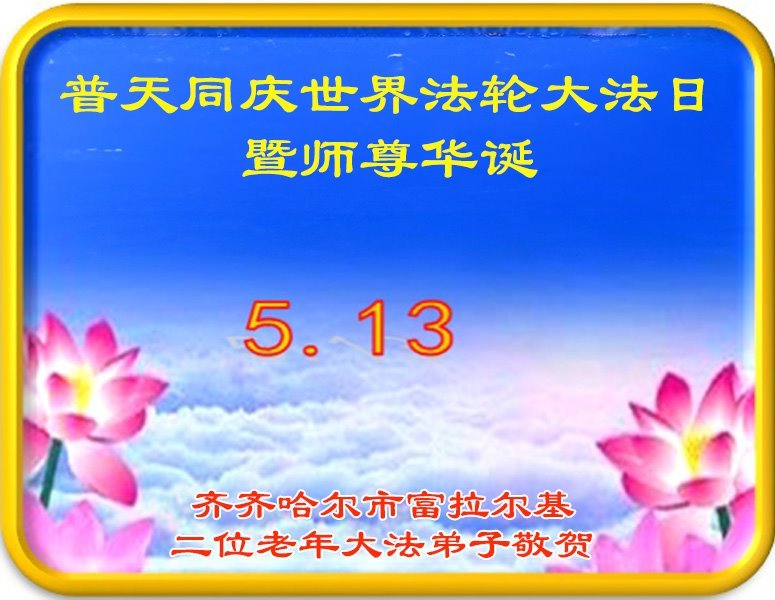 黑龙江省齐齐哈尔市富拉尔基二位老年大法弟子恭祝师尊华诞!恭贺世界法轮大法日!