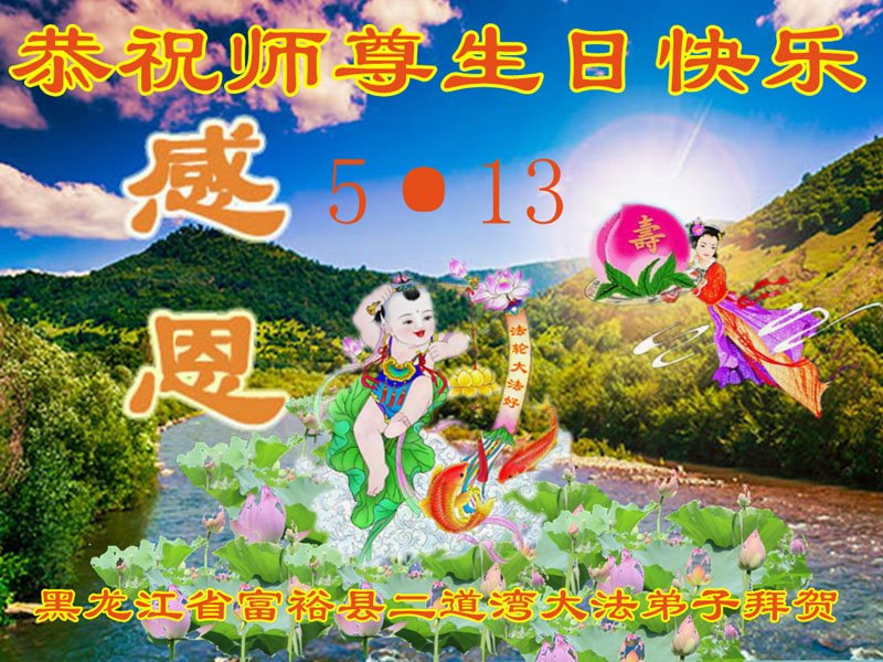 感恩 真相送進千家门 善良人家接福音 忍让和谐无量寿 好在三:退.财源深 感恩世界大法日 敬祝师尊过寿辰 黑龙江省齐齐哈尔市富裕县二道湾大法弟子恭祝师尊生日快乐!