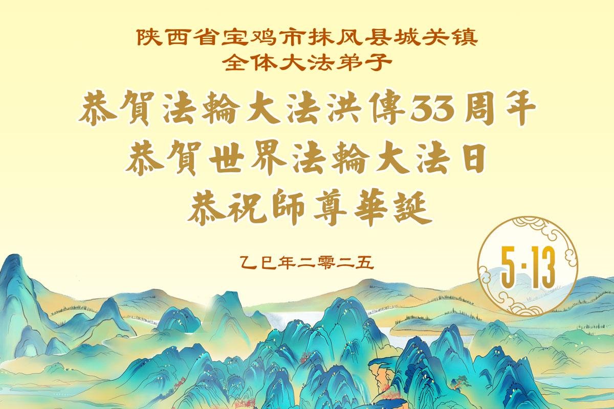 恭贺法轮大法洪传三十三周年!恭祝师尊华诞! 陕西省铜川市耀州区大法弟子恭贺世界法轮大法日!