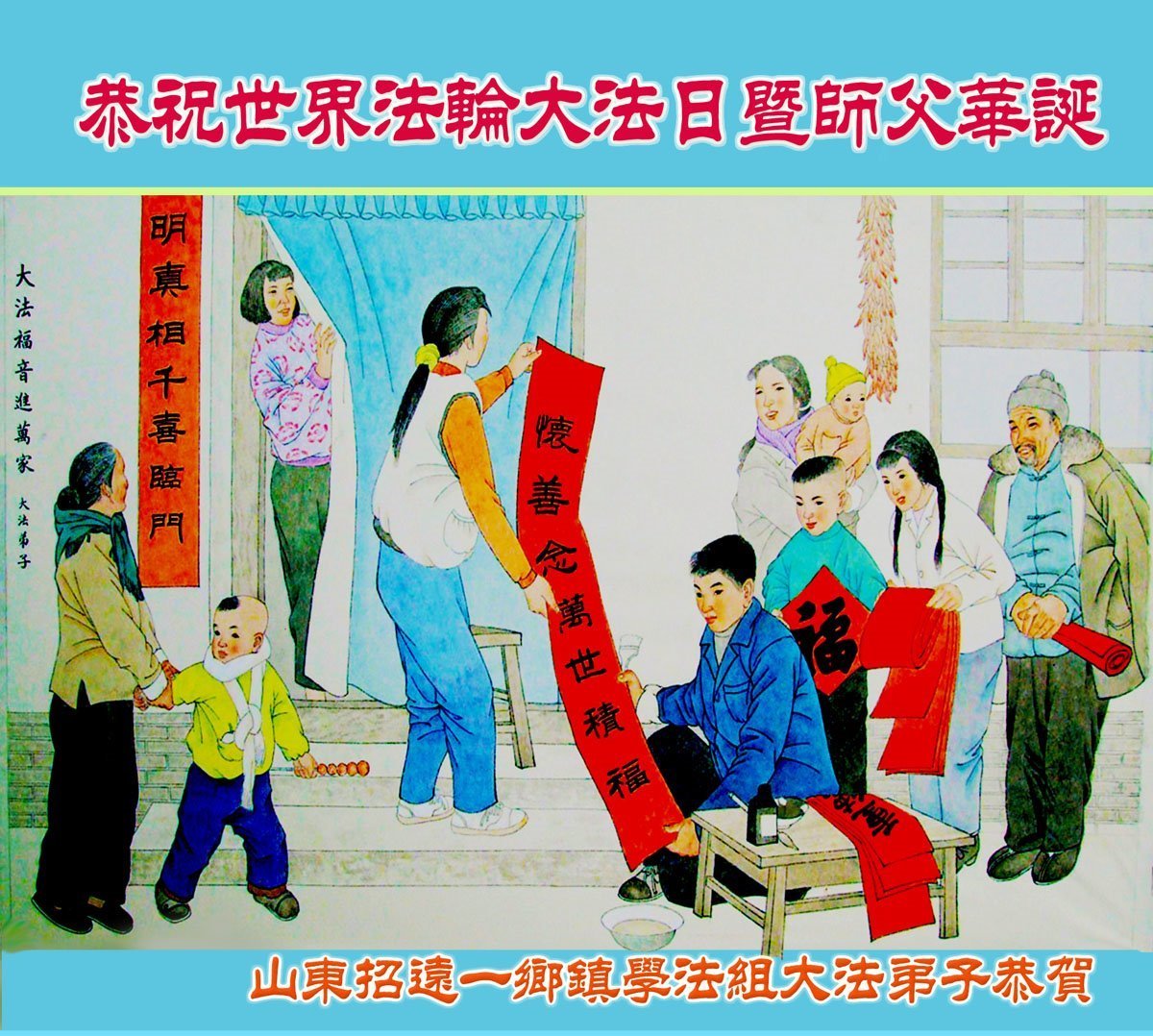 在世界法轮大法日来临的时候,我们都很想念远在大洋彼岸的慈悲伟大的师父,是师父把我们从地狱里除了名,引导我们走上了返本归真的光明之路。在我们多年的修炼中,步步看护着我们,用法理不断的点悟着我们,让我们能在中共邪恶打压下走了过来,师父为我们操尽了心。我们心中的无限感恩无法表达,只有一颗精進向善的心,听师父的话,做好三件事报答师恩。 弟子恭祝世界法轮大法日二十六周年!恭祝慈悲伟大的师父生日快乐!弟子非常想念师父。盼望师父能早日回国,师徒早日大团圆。 弟子叩拜师父!师父您辛苦了! 山东省烟台市招远市一乡镇学法组大法弟子恭贺世界法轮大法日暨师父华诞!